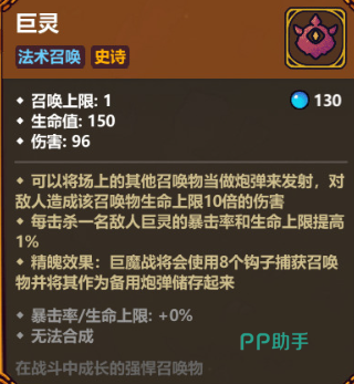 一项可成长型召唤技能,每次击杀敌人都会提升自身1%暴击率和最大生命值。其主要攻击方式为近战砸击;若场上有其他召唤单位,则会将其作为炮弹发射,造成相当于该召唤物生命值10倍的伤害。激活精魄效果后,额外获得8个钩子,可用于捕获并储存召唤物作为后续弹药。