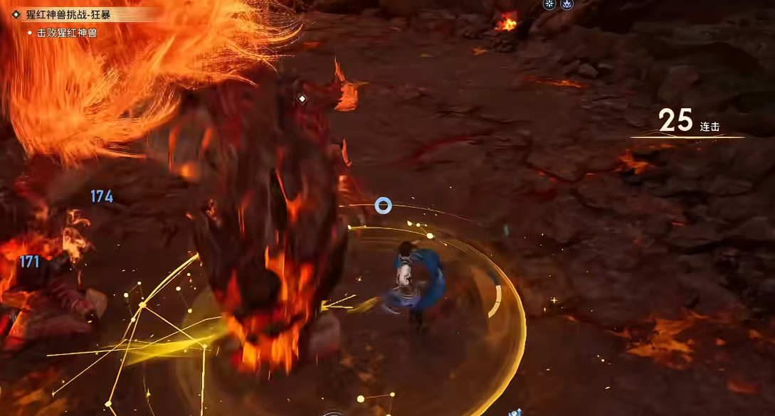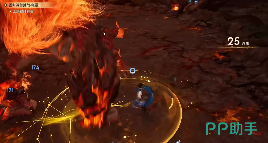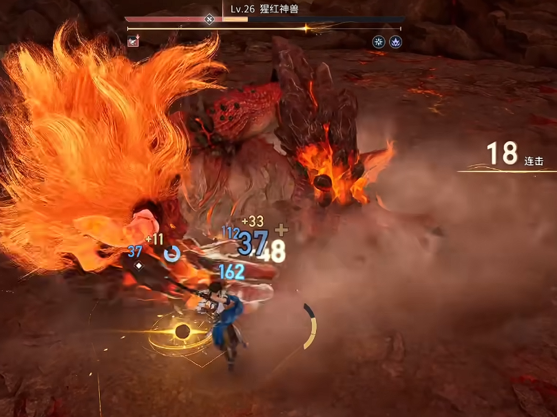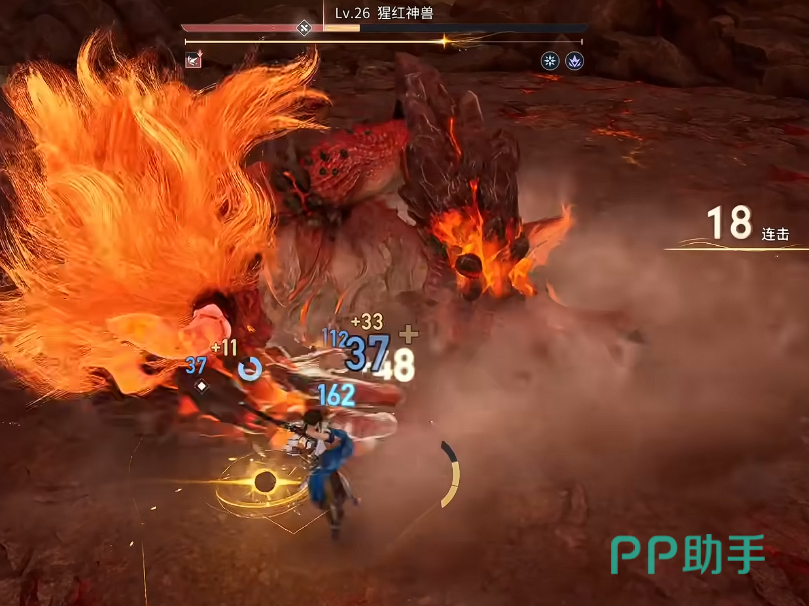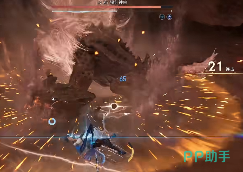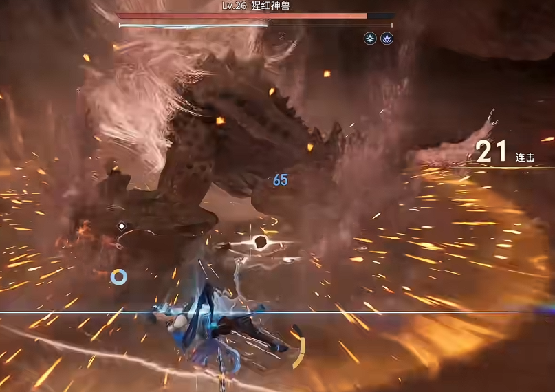 以副本Boss“猩红神兽”为例:该Boss存在明确弱点区域——尾部。当曜绕至其背后并持续输出约3秒后,Boss将俯身蓄力,随即向前方喷发熔浆路径。此时需在熔浆即将触地前0.3秒执行闪避,可精准触发闪光无敌状态(持续约2.2秒),期间不仅完全规避伤害,还可同步衔接大招完成反打,确保连击数不中断、血量全程满额。