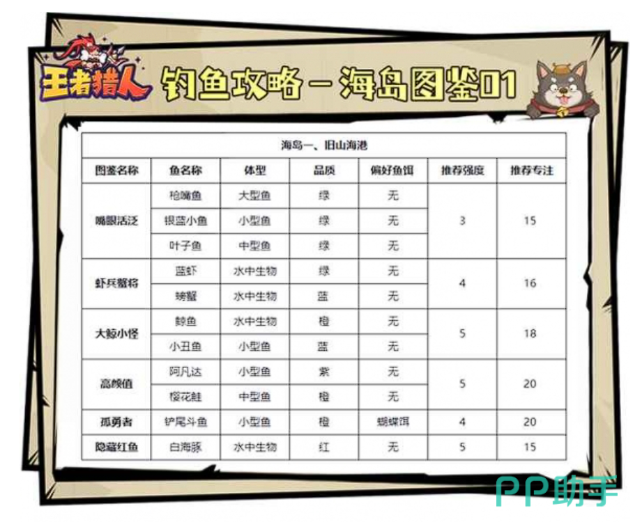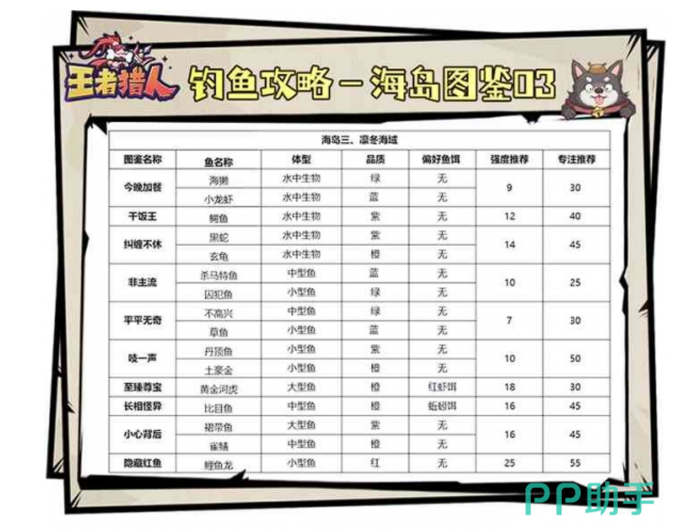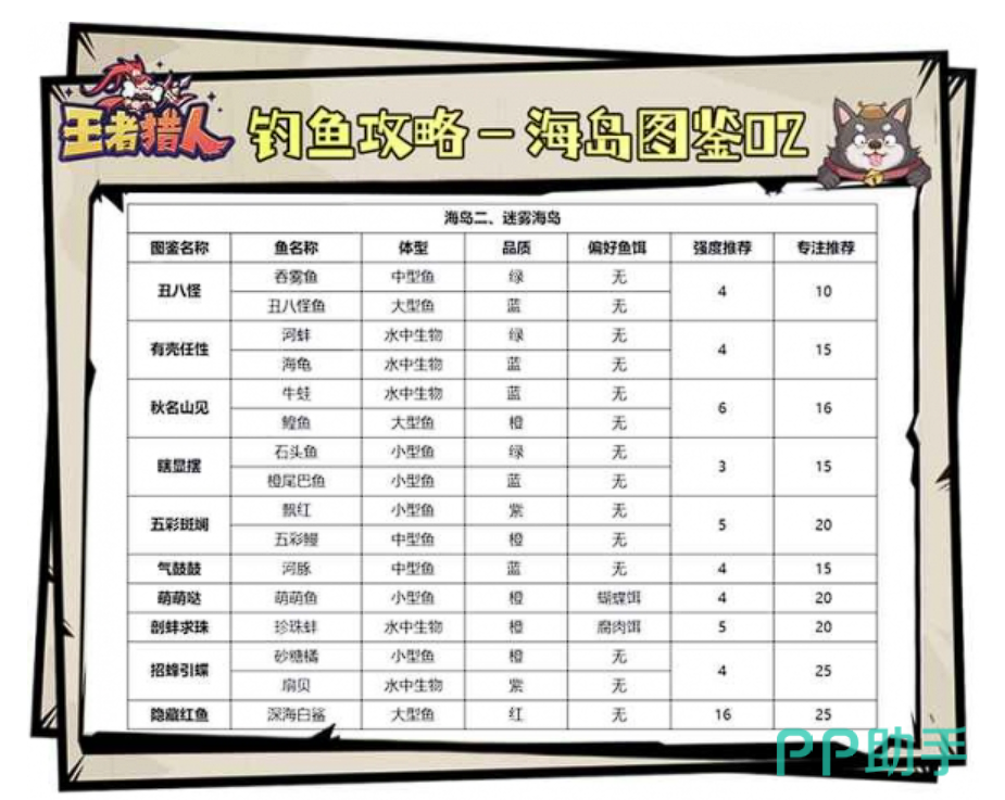 以上就是王者猎人中各海岛的钓鱼图鉴介绍。每个海岛都有其独特的鱼类和鱼饵,而且除了上述提到的鱼类,游戏中还有许多其他有趣的鱼类等待玩家去发现和收集。每个鱼类都有其特定的鱼饵和兑换价值,大家快去试试吧!
