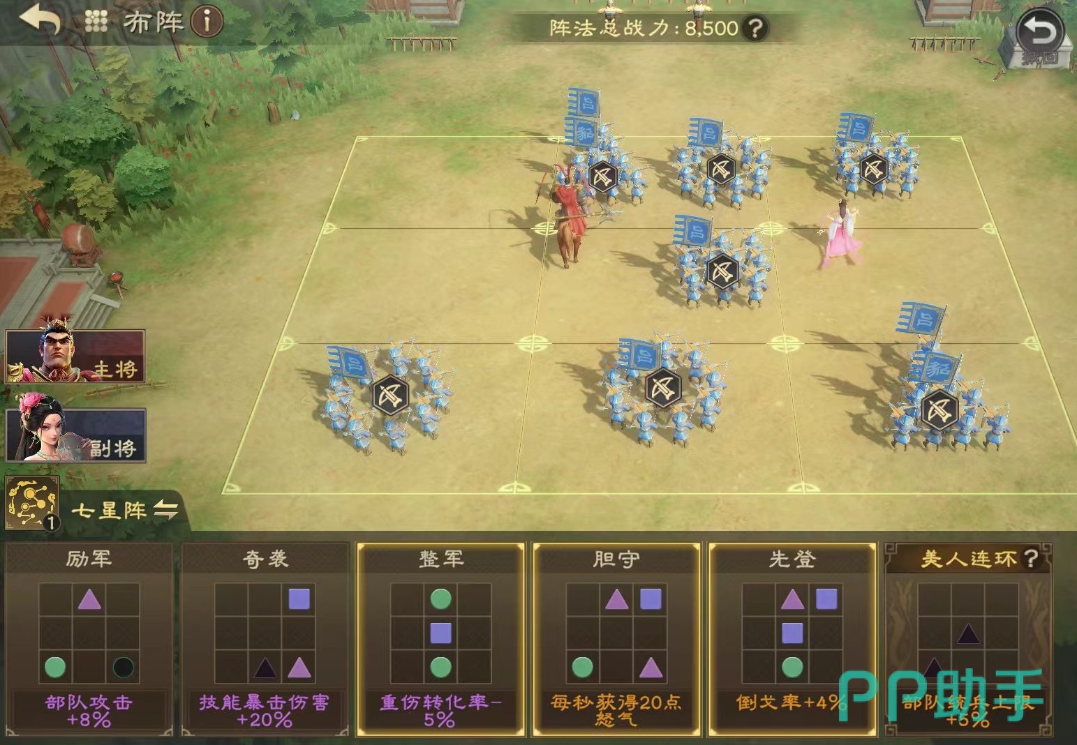 七星阵可通过提升军阶逐步解锁,也可通过限时活动或招募系统获取。作为珍品级别的阵法,它在实战中的表现尤为突出。当激活七星阵后,部队在进行普通攻击时,有20%概率触发效果,使接下来释放的主动技能伤害提升15%,持续时间为5秒。这一机制为依赖技能输出的阵容提供了稳定的增益支持,尤其适合构建以主动技为核心输出手段的战斗体系。