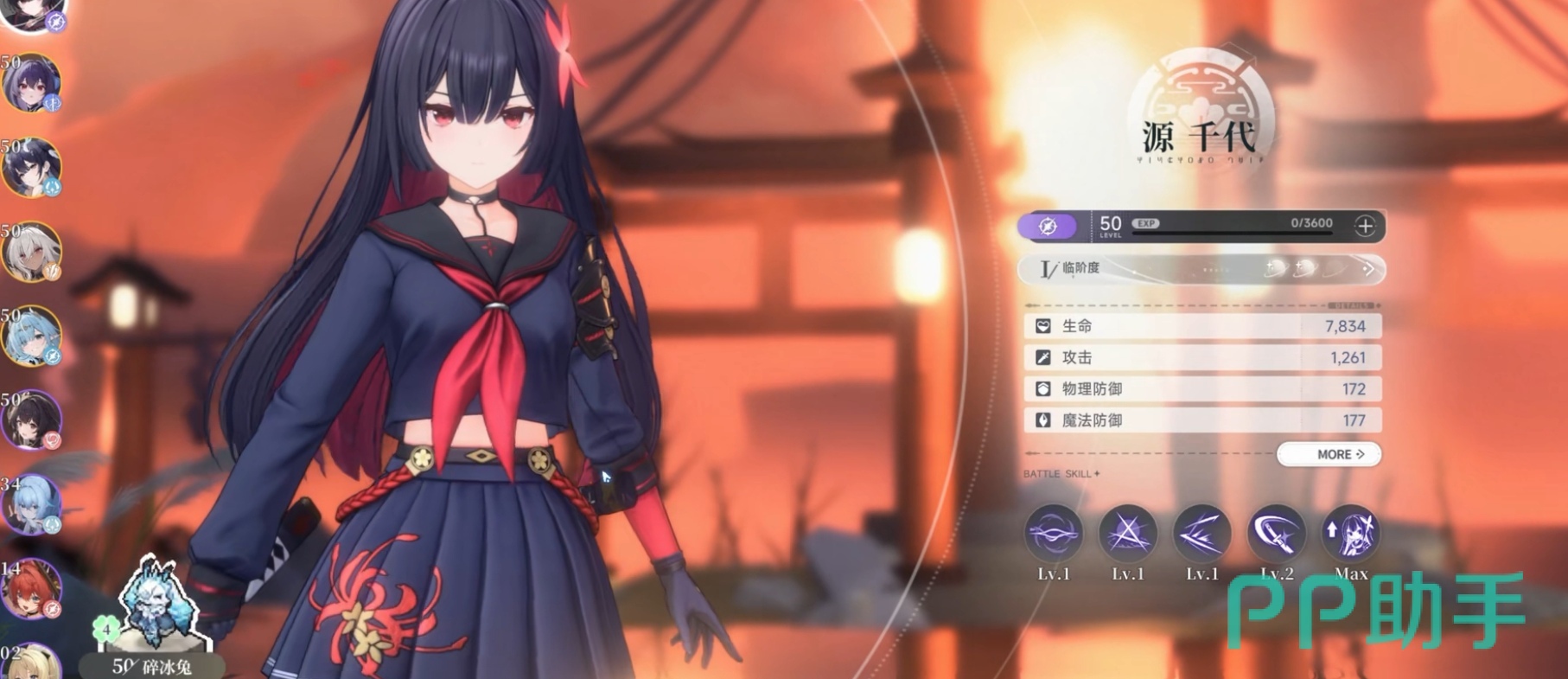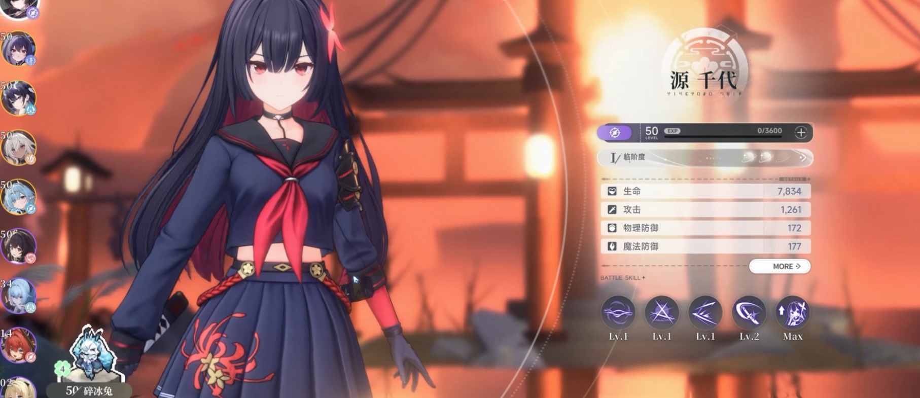 首位推荐角色:源千代。暗属性主输出位,武器为太刀。基础普攻可达成五段连续斩击,配合【鬼火】Debuff可激活重击斩杀判定;一技能【星鸣斩】具备大范围群体伤害,并显著压缩重击蓄力时长;终极技释放高额暗属性爆发伤害,同时在目标区域持续生成燃烧地带,提供可观的附加持续伤害。其操作门槛低、循环流畅、单体与清群能力均衡,是新手开荒与后期攻坚均表现稳定的首选主C。