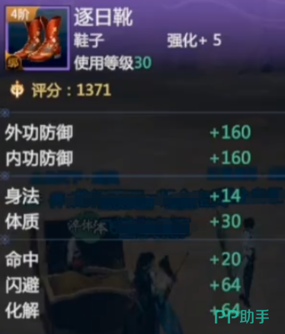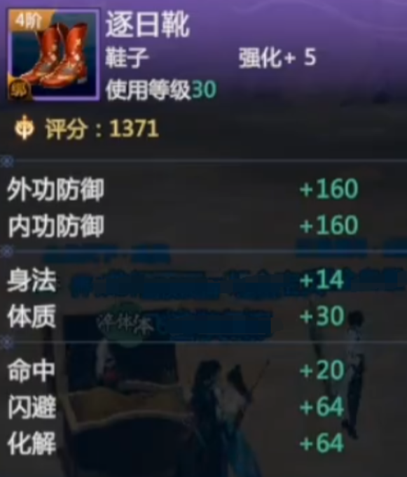 游戏中这个逐日靴需要30的等级才可以使用,如果玩家们想要来佩戴,首先需要提升自己的等级,同时还要达到强化物来获得1370多的评分,可以帮助前期玩家满增加自己的战斗力,它的加成还是非常高的,可以获得不俗的效果,在基础属性方面,大家可以来获得内部或者外部的防御能力,最高可以达到160,同时还可以增加自身的身法,原本是14点,最后可以加到30点。