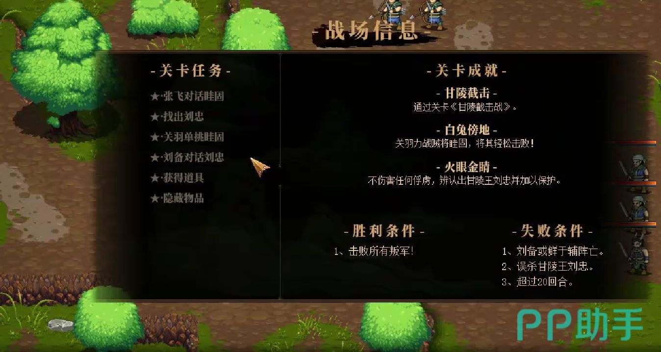 在游戏中,甘陵截击战中,除了要寻找刘忠,还需要张飞对话睦固,刘备对话刘忠以及关羽单挑睦固等等任务,这些任务是一连串的,玩家需要及时的完成,这样能够有效地推动整个游戏剧情的发展,也让游戏变得更加有意思。当然玩家在体验该游戏时能够了解这些历史人物的性格跟背景。
