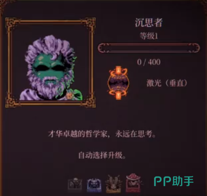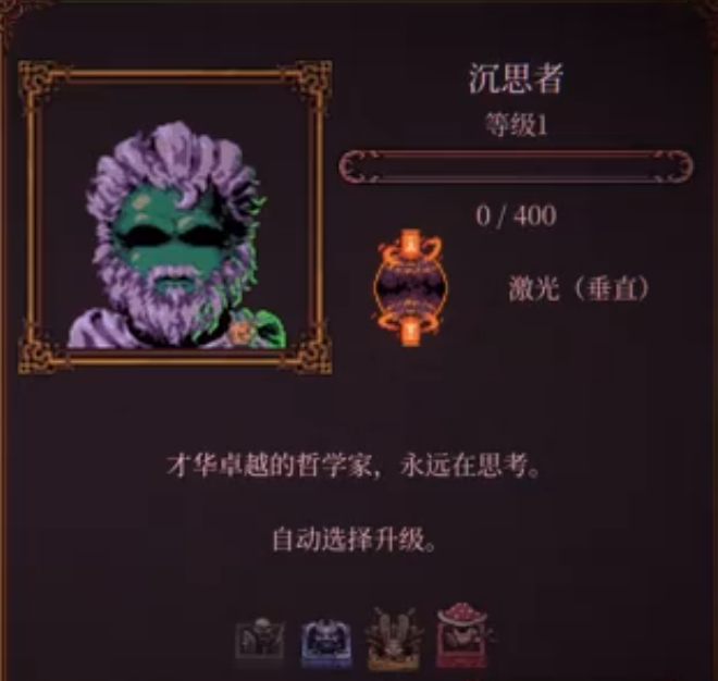 沉思者是本作中极具辨识度的角色之一,其人设原型为专注思辨的哲学者,战斗风格强调精准控制与垂直维度压制。该角色的基础攻击为一道自上而下的高能激光束,具备穿透多层障碍物的能力;随等级提升,激光可解锁宽度增强、冷却缩减、附带能量溅射等进阶效果,是清理密集敌群与击碎关键结构体的关键输出手段。