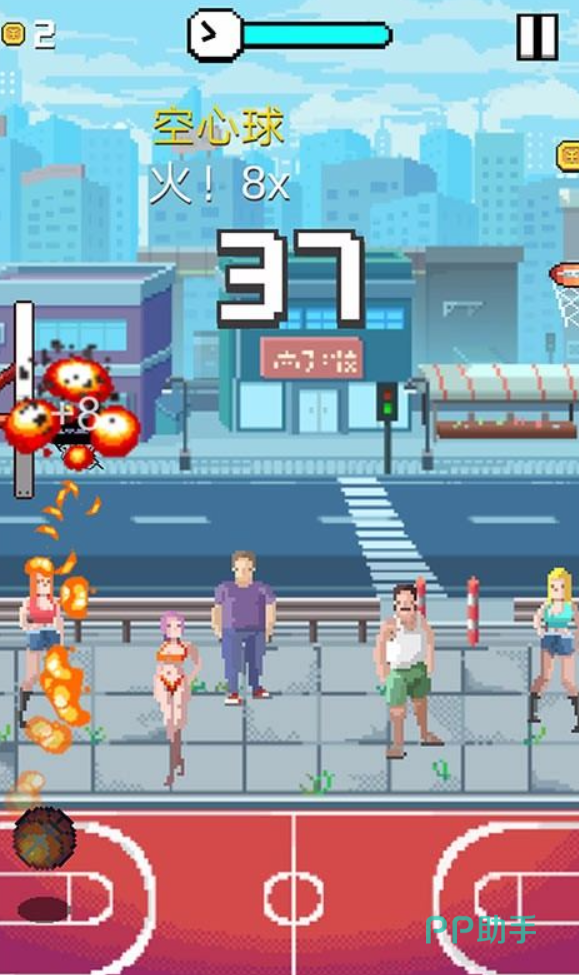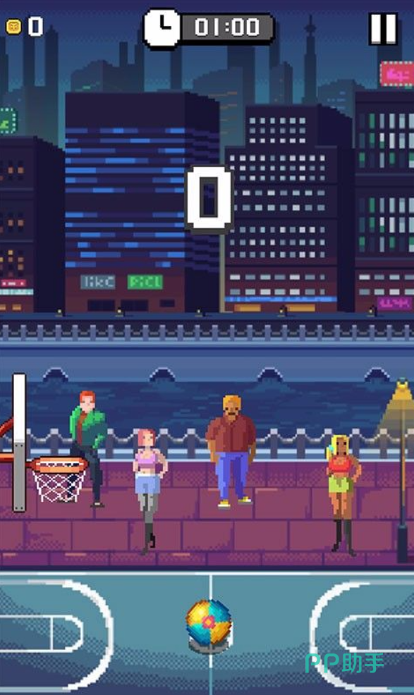 本作采用经典像素美术风格,界面简洁明快,操作逻辑直观易懂。玩家需要在限定时间内拾取篮球并完成投掷动作。投篮力度可通过手动调节,需结合篮筐高度与角色距离做出合理判断。此外,在比赛过程中,场边观众可能会投掷障碍物干扰你的出手节奏,但只要掌握预判技巧,便能有效规避影响。建议投球前留意周围观众的动作,避免意外失误。