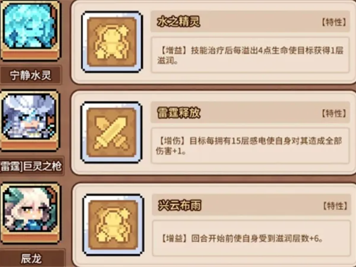 支援天赋配置需严格对应角色职能:宁静水灵绑定“水之精灵”,使其每次治疗溢出4点魔力时,额外生成1层滋润,极大提升层数累积速率;若中排启用巨灵之枪,则推荐“雷霆释放”,为其赋予15层感电并附加伤害加成;辰龙则适配“兴云布雨”,确保每回合初始即获得6层滋润,从根源加速流派成型节奏。