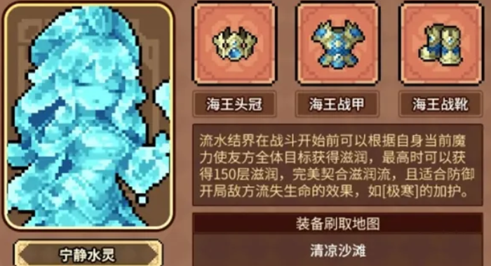 装备配置方面,辰龙优先选择青龙套。该套装附带“翻云覆雨”特效,可显著提升感电层数叠加上限,并在滋润层数充足时,将感电伤害转化为更高倍率的持续输出,实现滋润与感电双流派兼容。宁静水灵则必选海王套——其核心被动“流水结界”可在战斗开始时,依据自身魔力值自动为全体友方叠加滋润层数,是全队滋润启动效率与总量上限的关键保障。