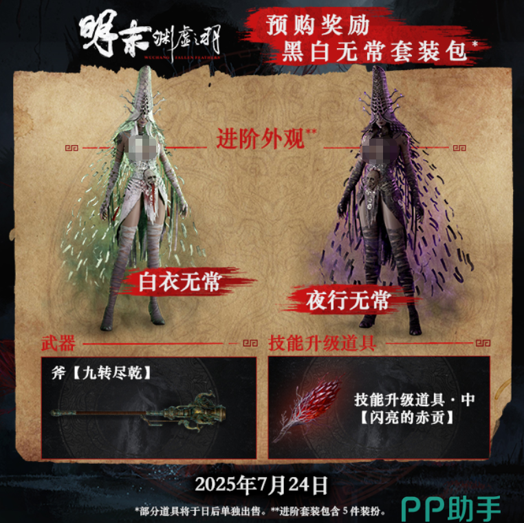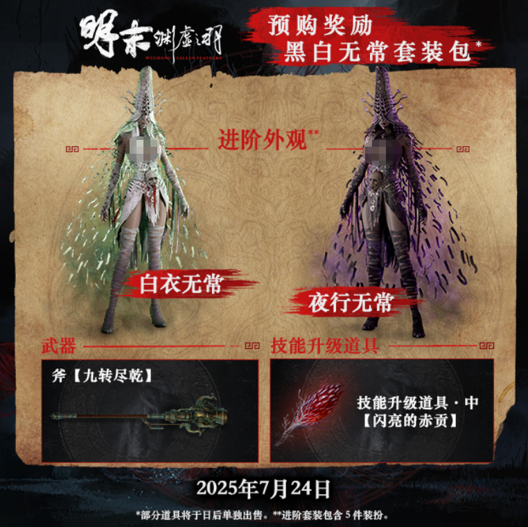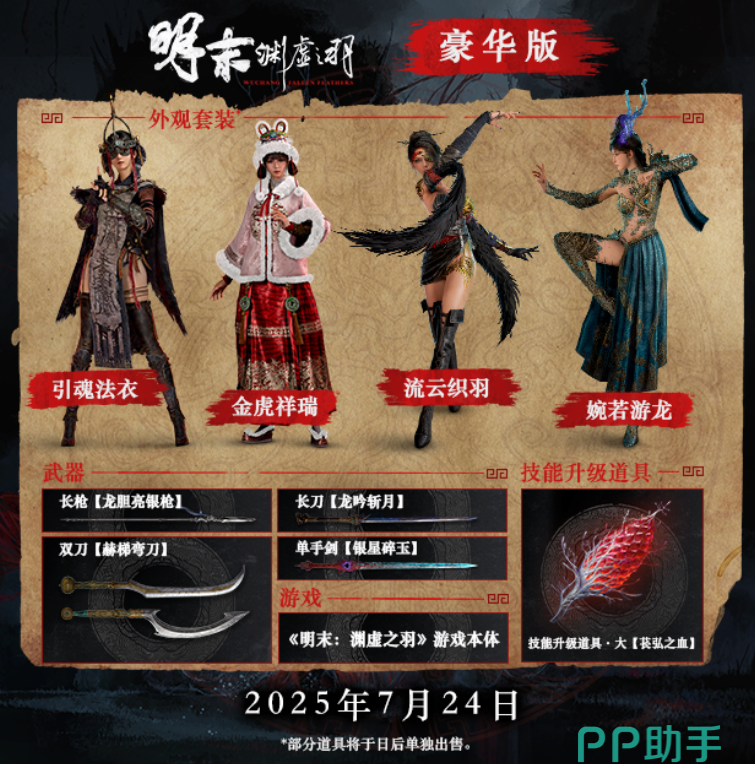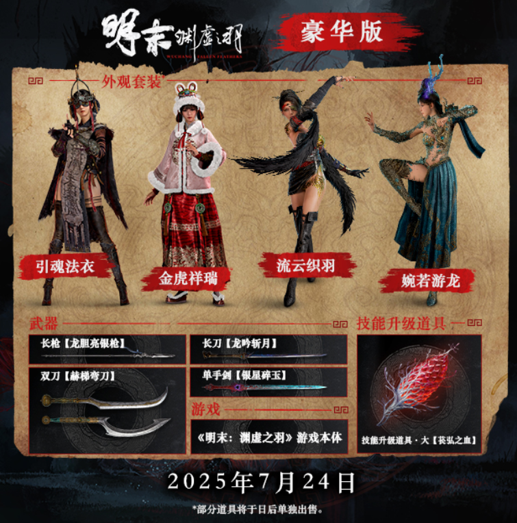 根据官方最新消息,《明末:渊虚之羽》已确定于2025年7月24日正式发售,并同步登陆Steam、Epic、Xbox/PS5平台,且首发加入XGP。目前游戏已在Steam等平台开启预购了,标准版定价248元,豪华版298元,预购奖励包含角色皮肤和武器道具。