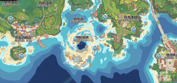 玩家来到地图的下方,马上就能看到有一个沉船漩涡。通过传送点就可以迅速的来到红圈位置,这里就有一个副本。进入到副本之后,可以通过传送门让水位逐渐的上涨。接着来到三个传送门的附近,然后通过中间的传送门进去。