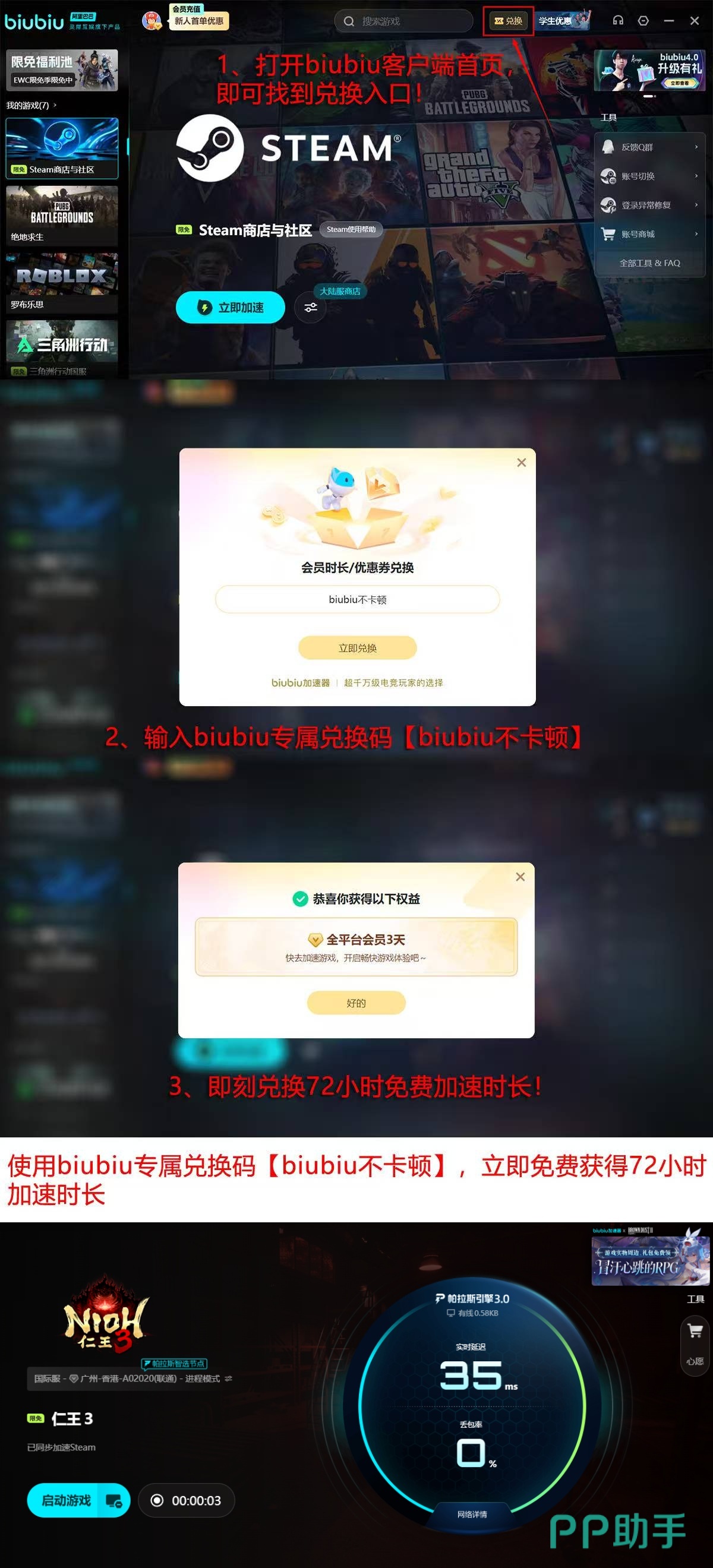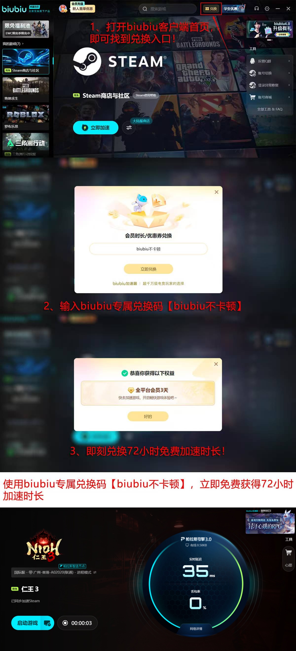 新用户注册并完成首次登录后,即可领取24小时免费加速时长;同步输入激活口令【biubiu不卡顿】,还可额外获得72小时加速权益。两项叠加,首登用户总计享有96小时全平台通用加速服务,充分覆盖新手适应期与中期内容攻坚阶段。