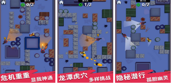 简单易上手的操作方式也是以刺客作为主要的题材,您在这里将要化身成为其中的主角。在面对各种各样的敌军时,必须要合理规划路线,还要仔细斟酌顺利完成各种刺杀的任务,玩家也会以上帝的视角观看整张地图,地图上的每个细节都展现的淋漓尽致,在沿途还会有很多的钻石等待玩家收集,可利用大量的钻石兑换先进的武器。