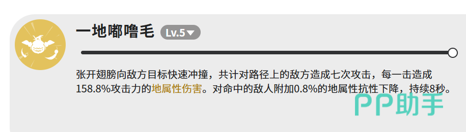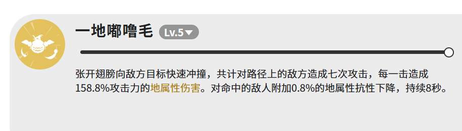 主力技能「一地嘟噜毛」等级上限为LV.5,释放时嘟噜张开双翼高速突进,在行进路径上完成总计7段打击,每段造成158.8%攻击力的地属性伤害。若全部命中,可累计削减目标5.6%地属性抗性,持续8秒。该效果虽单次微弱,但叠加后对地系队伍的整体DPS提升显著。实战中建议优先瞄准敌人集群区域释放,最大化命中次数以激活抗性压制收益。