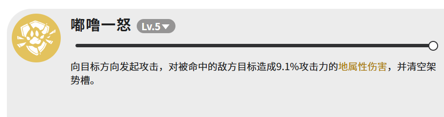 终结技「嘟噜一怒」同样可达LV.5,向指定方向发动单体冲击,基础伤害仅为9.1%攻击力,几乎不具备独立输出意义。其真正战略价值在于强制清空目标当前架势槽——这一机制可打断敌方蓄力动作、解除格挡姿态、中断特殊状态维持,为队友创造破防窗口。在协同作战场景中,该技能常作为连招启动点或关键控制节点使用。