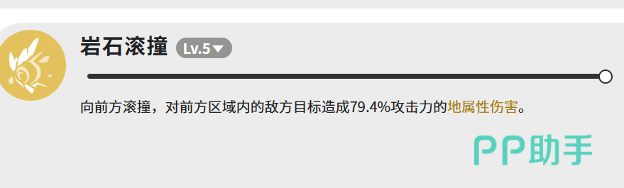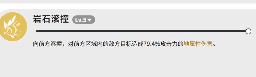 「岩石滚撞」为范围型输出技,LV.5状态下向前方扇形区域发起滚动撞击,造成79.4%攻击力的地属性伤害。该技能冷却时间短、释放前摇低,适用于快速清杂、衔接主技能空档,或在走位受限时作为应急输出手段。