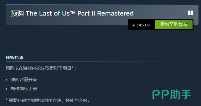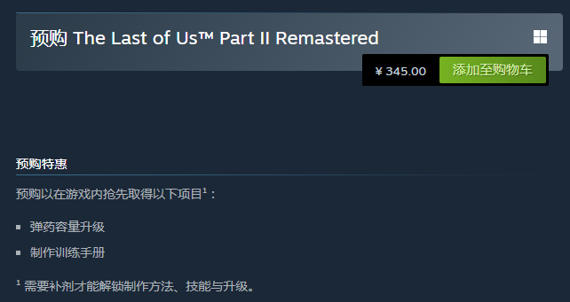 现在游戏已经开启预购,预购价格为345元。玩家如果选择预购就可以先获得以下的项目,例如弹药容量升级,还有制作训练手册等等。要比其他的玩家在游戏中更有更多的优势。