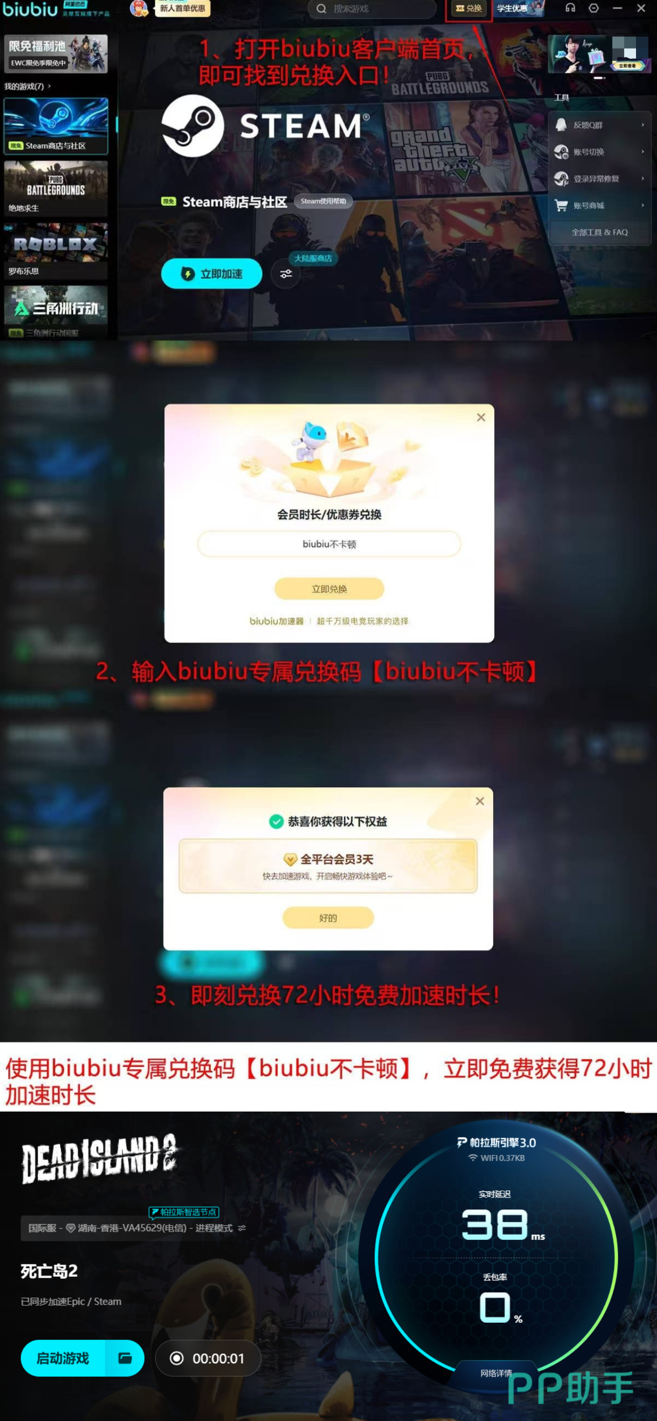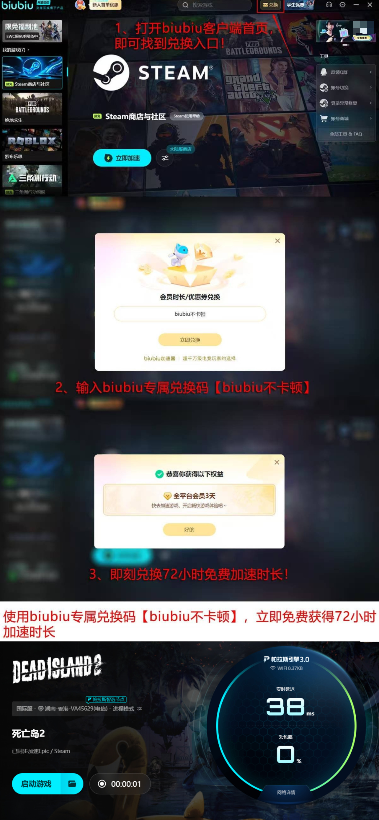 新用户注册后可立即领取24小时全游戏免费加速权益,覆盖Steam客户端及全部已安装游戏;所有活跃用户还可通过口令【biubiu不卡顿】额外领取3日通用加速时长,无需付费订阅即可使用。