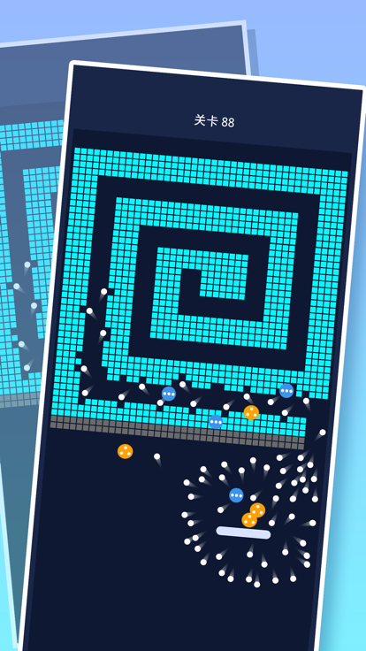 《砖块破坏者》每个场景里都存在着不同的轨道,并在轨道之中都加入了颜色异彩纷呈的像素砖块,游戏设计精益求精打造的一键式操控系统,所呈现的玩法把挑战和乐趣,进行了创意独到的并存结合,其中还加入了万象纷呈的闯关元素,我们需运用挡板,结合小球物理弹性的机制,去把轨道中的砖块全部破坏掉。