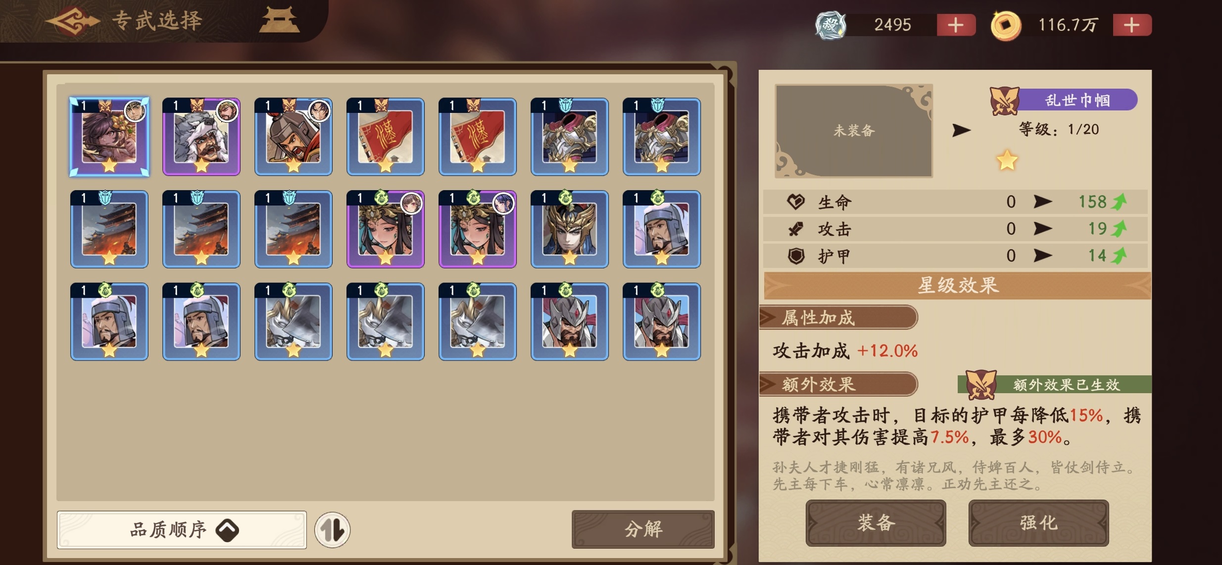 装备搭配方面,专属武器推荐【乱世巾帼】,其效果与王朗技能高度契合——目标护甲越低,王朗造成的伤害越高,形成“降防→增伤→再降防”的良性循环。锦囊选择上,【万箭齐发】可高频触发必杀技,加速状态积累;【火攻】【决斗】则适用于单点压制场景。属性培养优先级为:主属性选择速度、攻击加成、暴击伤害;副属性聚焦暴击率与暴击伤害。阵容适配建议搭配具备前期压制或控制能力的武将,例如孙尚香(高机动速攻)、徐盛(稳定减益),以弥补王朗前期输出爬升期的节奏空档。