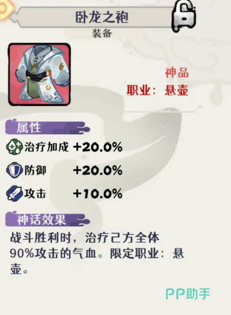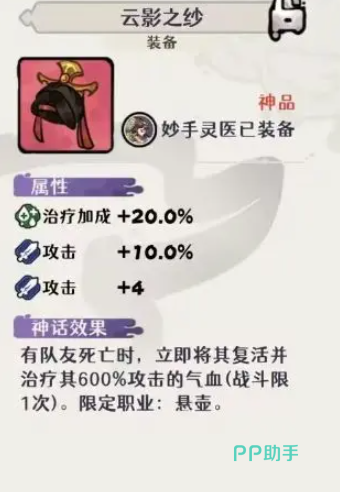 悬壶职业专属神话装。提供20%治疗加成及10%外功攻击加成(额外+4攻击),其主动机制为“云影回生”:当任意友方单位阵亡瞬间,立即复活该目标并恢复其600%攻击值的气血,具备极强的团战容错与翻盘潜力。