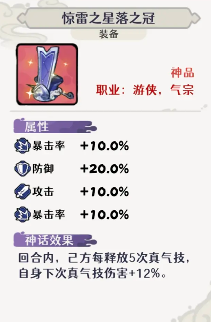 限定气宗、游侠使用。提供10%暴击率、20点防御与10%攻击加成;特效“星轨叠势”规定:己方每累计释放5次真气技,使用者下一次真气技伤害提升12%,属典型的越战越强型装备,契合高频真气技循环流派。
