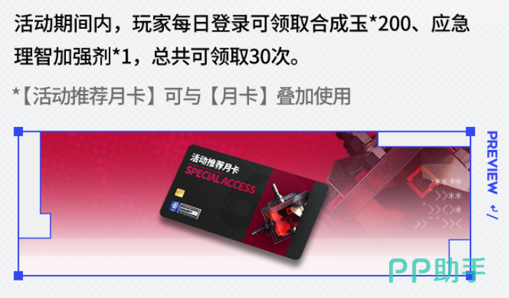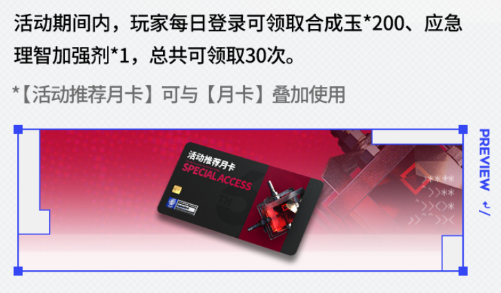 接下来,就是大家最熟悉的月卡奖励了。在这次活动期间,每天登录都会赠送200合成玉,以及1个应急理智加强剂,累计领取30次。没错,不管你是月卡用户还是非月卡玩家,这波福利都可以轻松收下,而且奖励还可以和常规月卡叠加使用,感觉就是赚翻了。