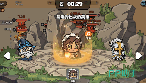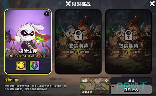 游戏中还有限时的生存玩法,每天中午和晚上限时开放,中午在十二点到两点,晚上则是八点到十点。在此挑战中匹配达到30人后即可开局,玩家可以在随机出现三位满级的英雄中任意选一位,没错在这个名为“探险生存”的模式里不存在数值的压制,人人都是满星王者,但如果三位英雄你觉得都不好操作,也可以选择使用一定数量的钻石重置(上限刷3次),这也是游戏方为了让新手们更快的掌握每个人物的特点而设定,也是用心良苦了。在单排模式里,进入任意关卡,我们都可以看到随处可见的宝箱,玩家就将开启争夺资源的大战了,在单排里更考验的是玩家的操作和对游戏的熟悉度了,所以开到宝箱还请尽快离开。