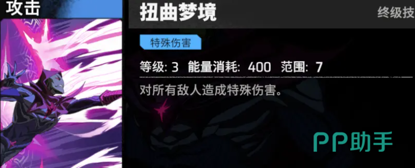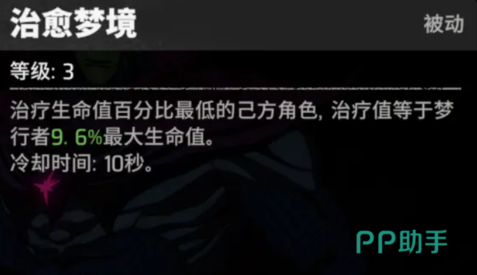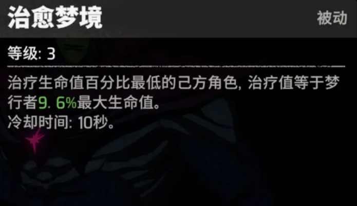 其核心技能之一为“治疗梦境”,这是一个每十秒触发一次的被动效果,可对生命百分比最低的友方单位进行回复,治疗量相当于梦行者自身最大生命值。此外,该技能还具备自动治疗机制,恢复数值与其当前生命值相关。攻击类技能方面,“扭曲梦境”能释放范围性能量打击敌人,造成可观伤害;而“梦之力”则可在每次普通技能释放后叠加增益,提升后续输出强度——但此加成不会作用于终极技能,且可强化单体角色的梦境释放能力。