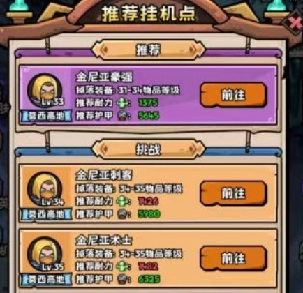 另外还可以通过挂机打怪的方式升级,挂机打怪能得到的主要是一些经验和装备,经验值有助于等级的提升,装备则是能让角色变得更强一些,战斗力更强的情况下,任务完成的速度会更快,但需要注意的是,挂机打怪要选最适合自己的位置,可以点击游戏的右侧,在这里系统会有详细的提示,会推荐每一个等级最适合前往的挂机地点,玩家可以根据自身等级选择出一个地点,这样在战斗的时候获胜率也会更高。