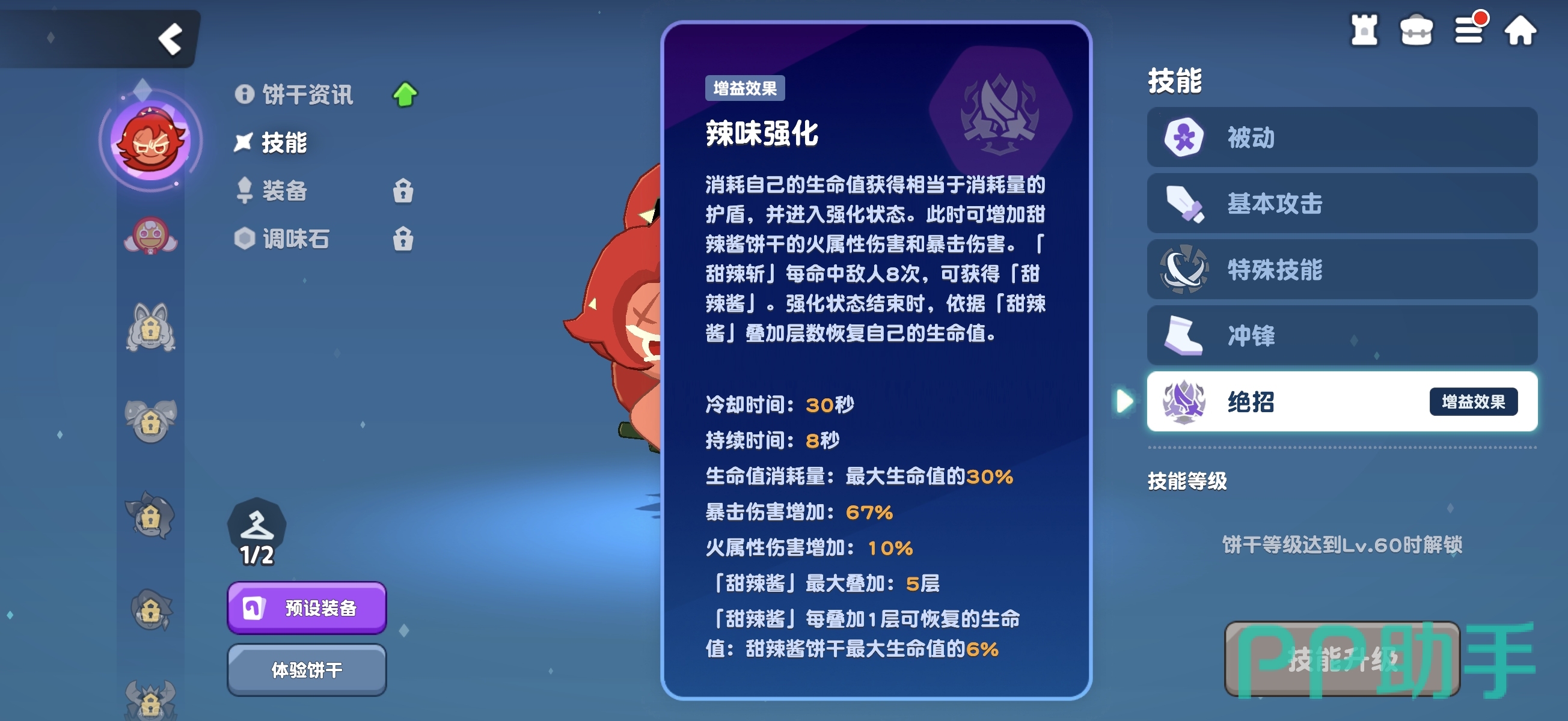 普攻共四段,前摇短、衔接流畅,末段伤害显著高于前三段;主动技能“甜辣袭击”具备位移+范围打击双重特性,施放后角色短暂消失并瞬移至敌方密集区域发动快速连击,冷却时间为9秒;终极技能“辣味强化”为核心机制——消耗自身30%最大生命值,立即获得等量数值护盾,并进入强化状态。在此状态下,火属性伤害与暴击伤害大幅提升;每成功命中敌人8次,即可叠加1层“甜辣酱”效果,最多叠加5层;强化状态结束时,依据已叠加层数恢复生命:每层恢复6%最大生命值。综合计算,该技能在合理操作下具备极高的净收益比,兼具承伤、增益与续航三重价值。