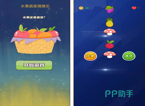 在食物中,水果和蔬菜,除了口感不同,外形也是不一样的。这款通过快速识别,所显示出来的到底是水果还是蔬菜,就能帮助玩家获得分数,也是具有一定挑战性的趣味性游戏。在玩的时候,会不断的在屏幕上方掉落水果和蔬菜,看到了水果时,你直接点击这两个字。如果看到的蔬菜,也要点击蔬菜这两个字,点击错误的情况下,意味着游戏失败。