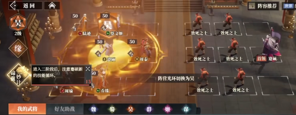 还有配队2则是周瑜、陆逊、孙权、步练师、曹仁和关羽的组合,这个阵容与配队1类似,但更加注重生存能力和控制效果。步练师作为奶妈角色,可以为队伍提供持续的治疗支持,曹仁则可以增加队伍的防御力和生存能力,关羽则是一个强力的物理输出角色,可以在必要时补充队伍的伤害,其实这里陆逊天赋2级用处较小,建议可以直接开到3的时候再开,通常陆逊把握好时机,扩散出去的总层数可达8层以上,换算240%倍率。