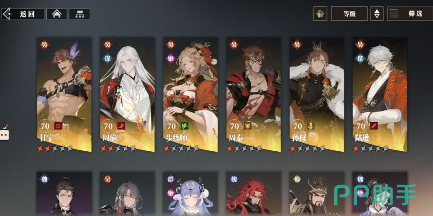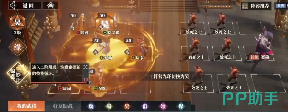 周瑜一定要到三星,不然在引爆不了几层的情况,耗费战意较高,收益太低,PVE通常没必要抢那么一回合,PVP很有用,其中的核心辅助就是孙权+步练师,关键星级及突破,孙权天赋2>孙权星级3>步练师天赋>步练师星级,前期不用投入太多资源,孙权天赋2优先点出来,加速循环,天赋3可以暂缓。