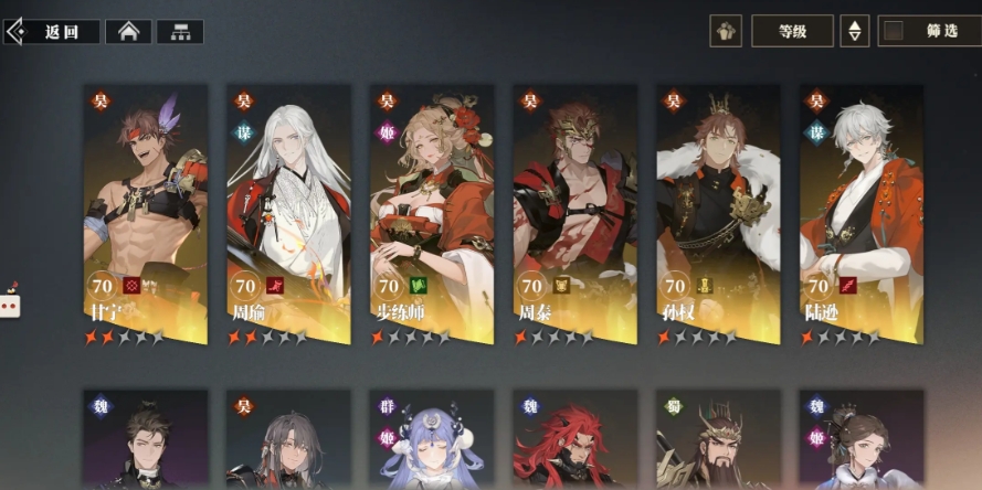 周瑜和陆逊的搭配是最关键的部分,其中关键星级及突破顺序为,周瑜天赋3>陆逊星级3>陆逊天赋3>周瑜星级3,其中的角色可以提高灼烧伤害,是整个队伍的伤害基础,而陆逊的3星则提高了挂火频率,配合孙权夫妇双拉快速叠层,除了周瑜和陆逊外,其他角色也发挥着重要作用。