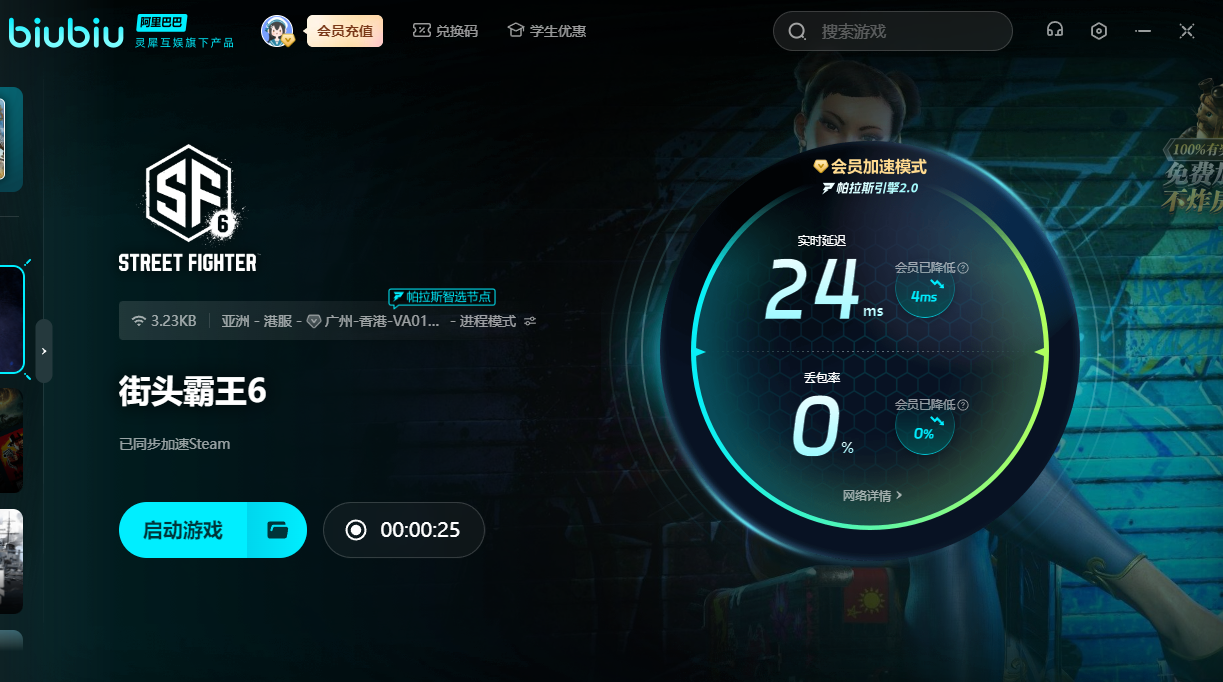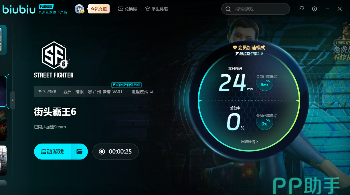 街头霸王6作为享誉全球的格斗佳作,所以暂时还没有上线国服。可时我们为了化身成为新的格斗家,要用上biubiu,方可参加国际舞台之间的格斗较量。对于新用户来说,可获得3小时的免费加速。另外新老用户输入【biubiu不卡顿】,就可额外领取三天免费加速。如果使用春丽战斗时太卡,就无法展现出多变的技能以及招式。用上加速器后,还可以彻底摸清角色以及敌人的套路,更快打出连招。