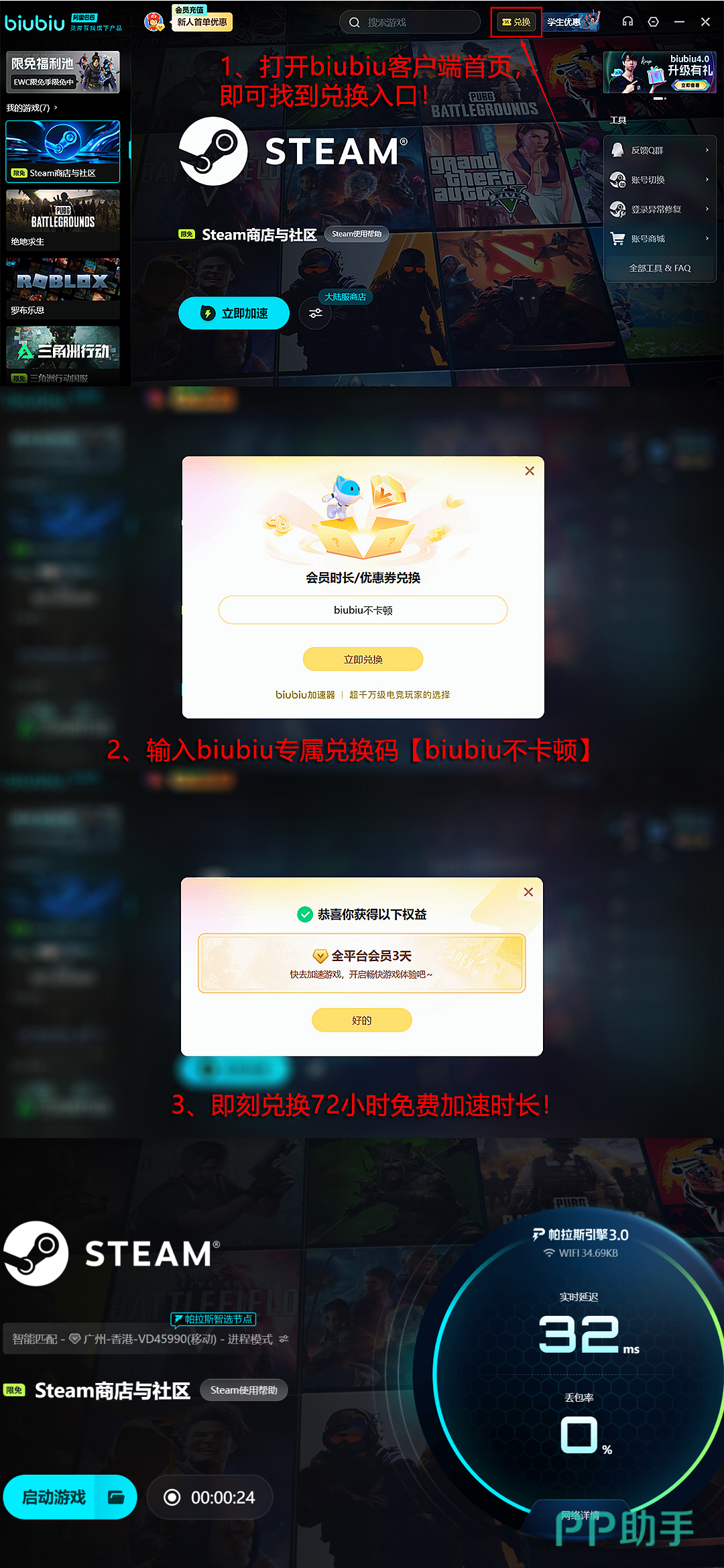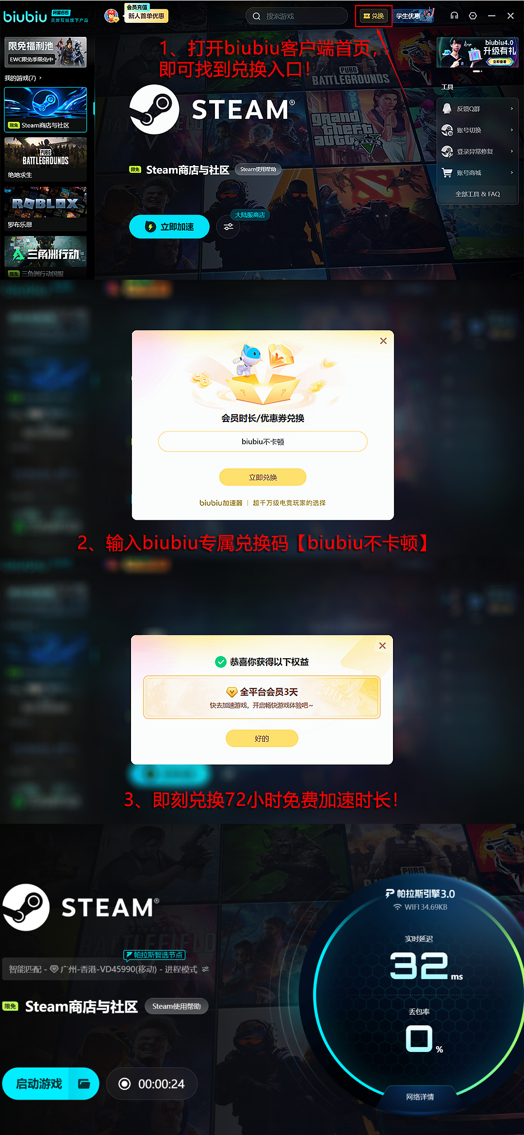 值得一提的是,新用户注册后即可享受24小时免费加速服务,现有用户输入兑换码【biubiu不卡顿】还可额外获得3天免费使用权限,让每位玩家都能无负担地体验高速网络带来的畅快对战感受。