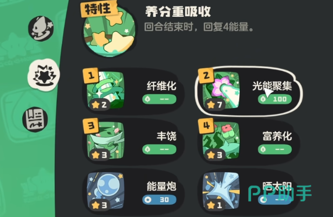 技能配置方面,必须携带纤维化、丰饶、光能聚合三大核心技能,并额外补充富养化作为辅助手段。若己方被敌方控制捕捉,富养化可为后续出场队友提供能量支持。若未获得首领形态,可用叶绿光束替代,结合自身特性实现每回合结束回复4点能量,进入首领化状态后提升至7点。只要所用技能消耗不超过7点能量,则可循环使用,达成理论上的无限回合运作。