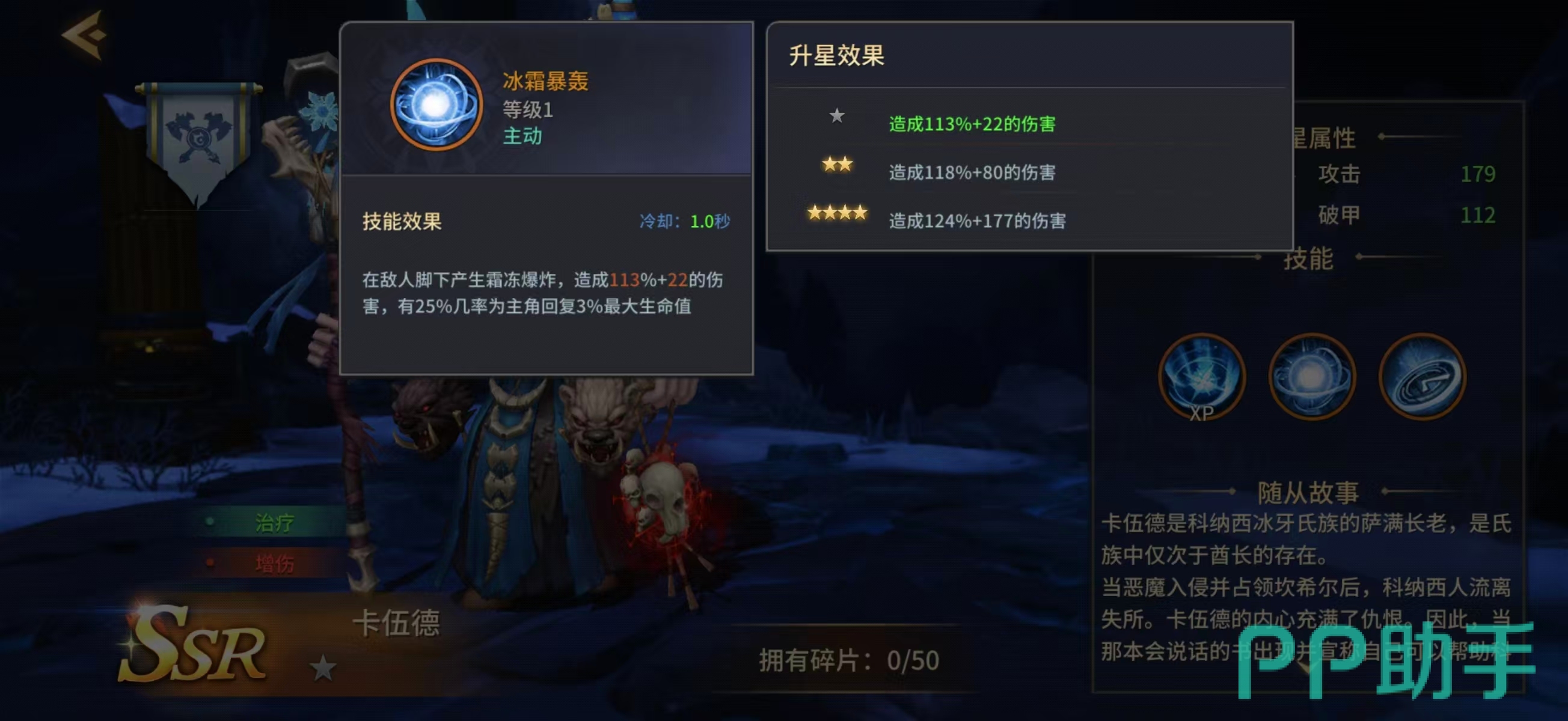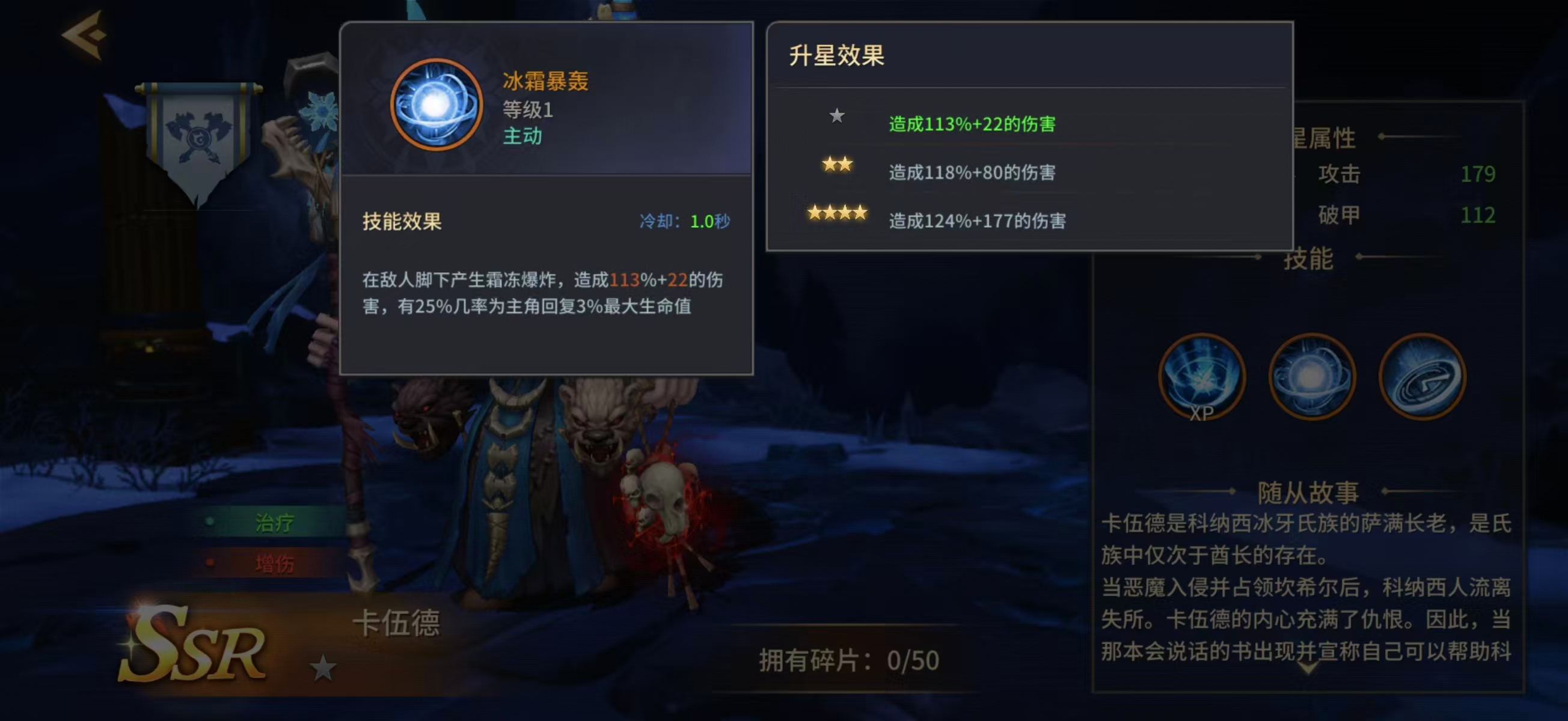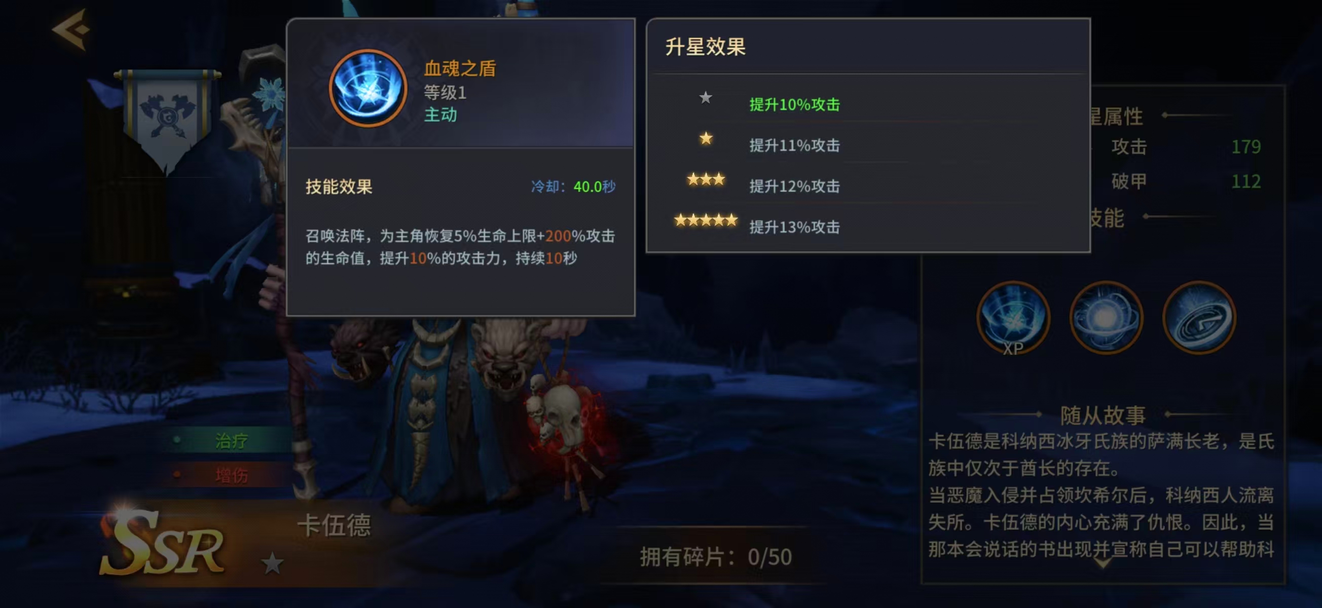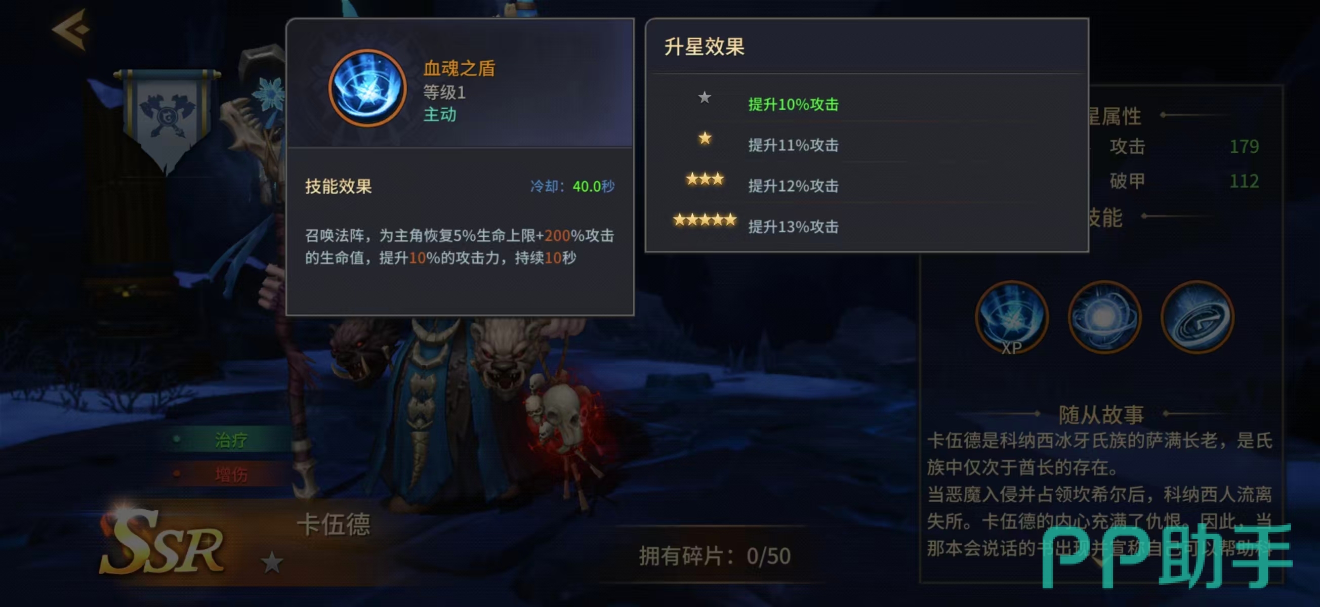 从技能结构来看:一技能为范围爆炸伤害,命中后触发25%概率为主角恢复3%最大生命值;升星仅提升基础伤害,治疗量恒定不变。二技能释放法阵,对目标造成伤害的同时,为主角回复等同于400%自身攻击力的生命值。终极技能开启大型法阵,为主角恢复5%生命上限 + 200%攻击力数值的生命,并附加最高13%的攻击力加成,持续时间固定为10秒。三项技能均具备治疗效果,且无冷却冲突或施法前摇限制,形成高频、多段、可叠加的续航保障。此外,卡伍德自身还提供10%常驻攻击力加成,显著强化队伍整体DPS输出能力,使其在辅助定位之外兼具团队增益价值。