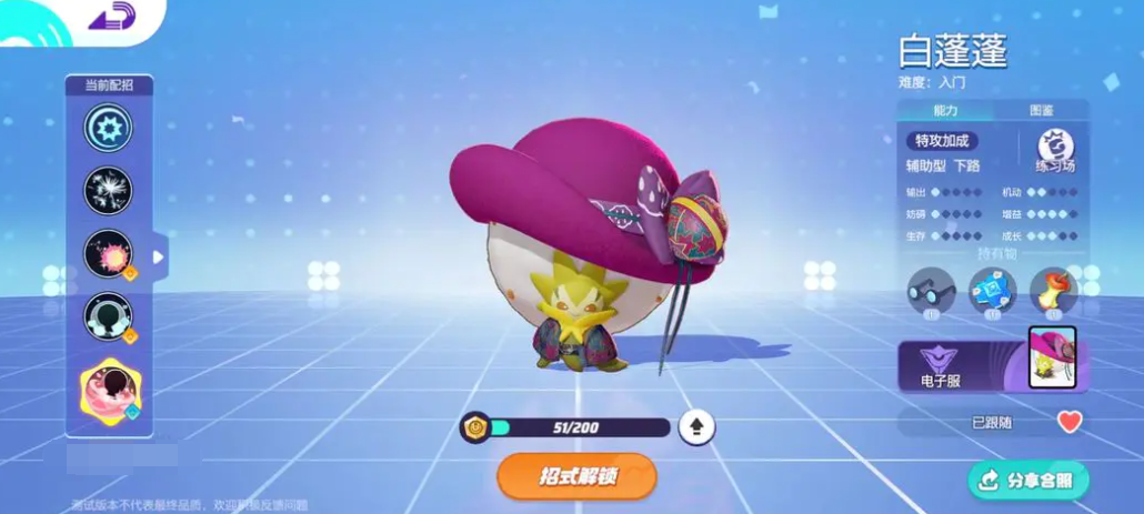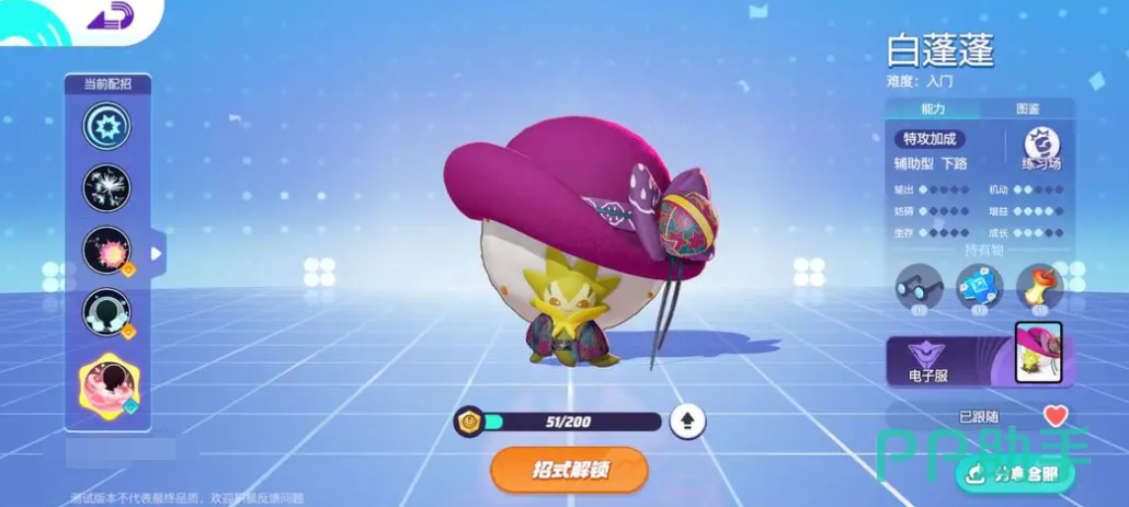 辅助型宝可梦则主要负责为团队提供增益效果和支援。白蓬蓬就是一个典型的辅助型宝可梦,它的技能中带有多个附带效果,可以伤害敌方并回复队友。会拉扯的可以利用平A配合队友打出高额伤害,为其他的友方宝可留出输出环境。