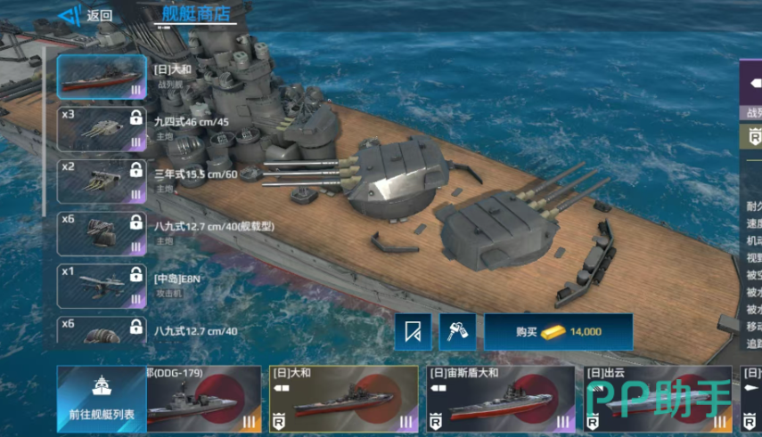 大和号是一艘三级战舰,需要花费14,000元在商店中购买,它最大的特点就是所有的武器都是锁定的,玩家们并不能根据自己的喜好来任意diy。不过由于这些武器都是紫色品质的,因此总的来说战斗力还是比较可观的,即使无法更改,也没有阻碍它成为一艘当前比较热门的战舰。从属性上来看,它的耐久达到了46,000,还是不错的,并且速度、机动性以及视野范围这些比较重要的属性,都达到了一个较为均衡的数字。