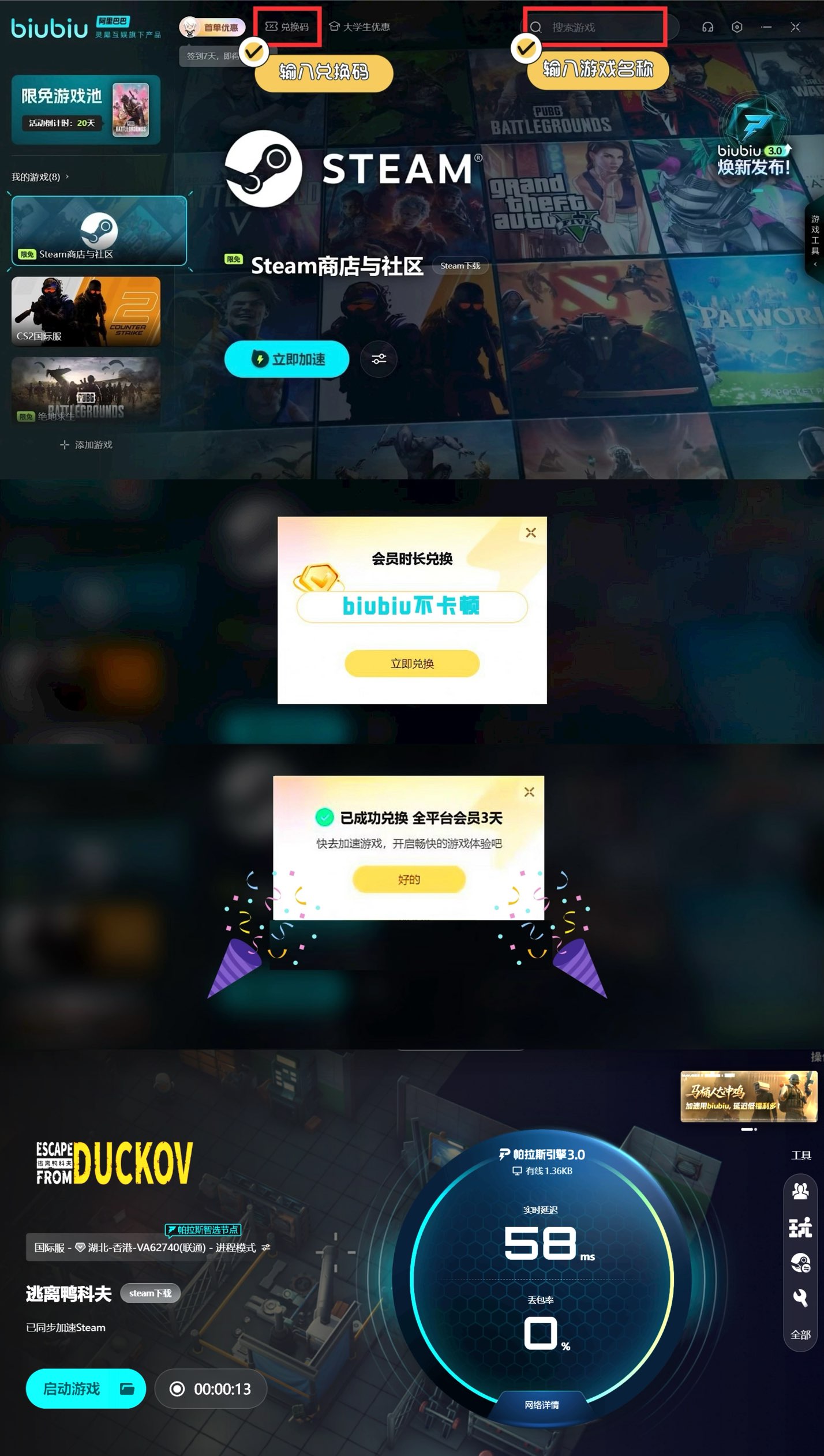 对于初次使用的用户而言,可能会对加速工具的效果存有疑虑。为此平台特别提供24小时免费试用服务,所有首次注册并登录的用户均可自动获得该体验权益,无需支付任何费用即可直观感受加速效果,判断是否满足个人需求。同时为回馈广大玩家的支持,现向全体用户赠送【biubiu不卡顿】专属口令,正确输入即可额外领取3天免费加速时长,累计可享受近百小时的高品质网络优化服务。