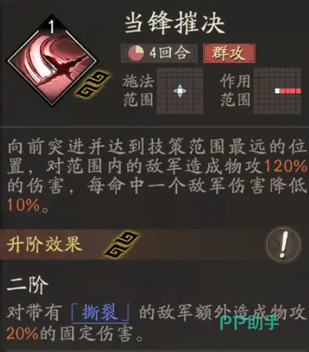 此外,当技能命中多个单位(超过两人)时,张辽将在下一回合获得短暂的规避状态,使敌方无法锁定其为目标,相当于提供了一回合的免伤保护。为了进一步提升输出效率,主动技能【当锋摧决】应优先升级至满级。该技能具备穿线打击特性,最多可覆盖五个敌人,每次命中后基础伤害衰减20%,但研修满级后衰减比例可降至5%,极大提升了持续输出能力。副将搭配方面,建议选择具有伤害加成或针对特定目标增伤效果的角色,以强化张辽的整体输出表现。