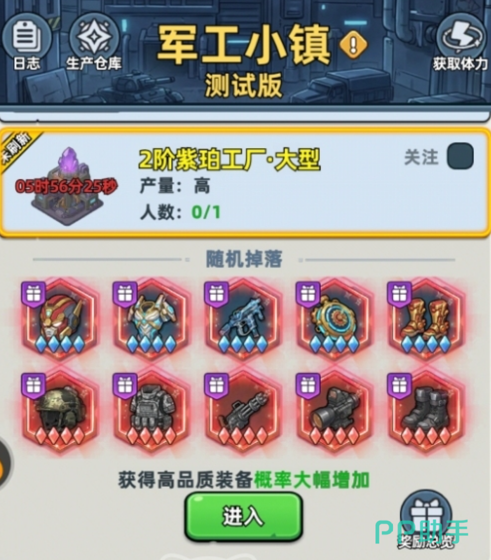 该系统需通过完成“军工小镇”主线推进解锁——玩家需清剿区域敌对势力,成功接管装备制造工厂后方可启动生产流程。工厂分多个品阶,不同品阶对应装备的基础资质上限与词条潜力区间。例如,三阶工厂产出的护甲初始防御值更高,且触发“减伤率+8%”类高价值词条的概率显著提升。体力为关键生产资源,每日上限固定,每次制造消耗依装备部件等级浮动;体力不足时可使用指定资源即时补充,保障装备迭代节奏不中断。