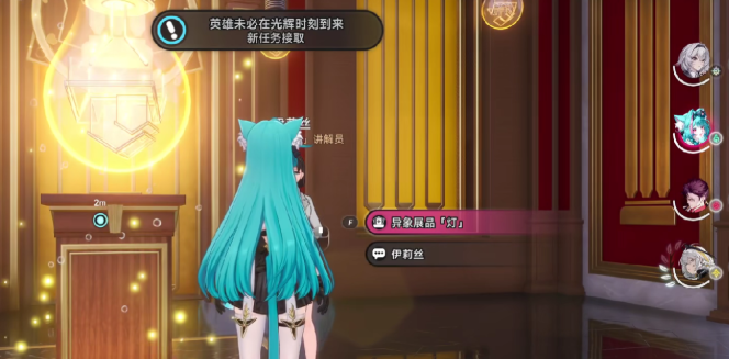 任务起始点位于新赫兰德区的钨丝展厅。进入大厅后,与金苹果场馆讲解员对话即可接取主线名为“英雄未必在光辉时刻到来”的委托。接取后请暂缓离开,按任务提示下行至展厅底层,与钨丝NPC展开深度交谈——他将讲述一段关键往事,由此正式开启任务核心流程。随后前往指定公园区域,与场景内角色互动,即可触发回忆世界剧情。该段叙事承载重要背景信息,直接影响后续线索理解与世界观补全,不可跳过。
