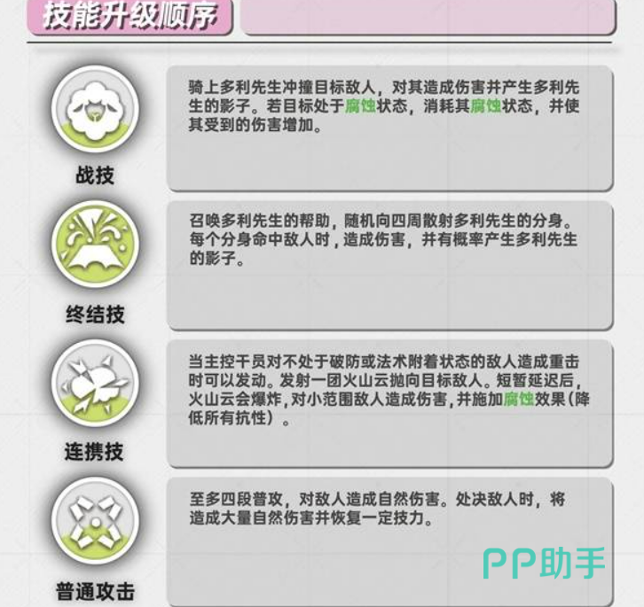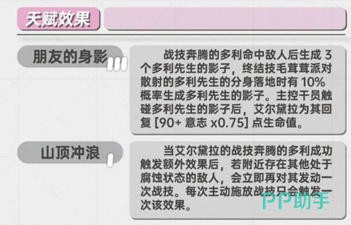 天赋体系是艾尔黛拉机制联动的关键。【朋友的身影】使主控干员接触多利先生影子后,自动对当前生命值最低的友方单位施加50%效果的额外治疗,形成双目标保障链;另一项核心天赋明确指出:战技每消耗1层腐蚀状态,即可为目标附加持续数秒的脆弱效果,使其受到的伤害提升10%,该增益可与高破甲队伍形成强力协同;终结技相关天赋进一步强化其功能性——持续时间+1秒、影子生成概率提升、能量消耗-15%,共同构成高效稳定的技能轮转基础。