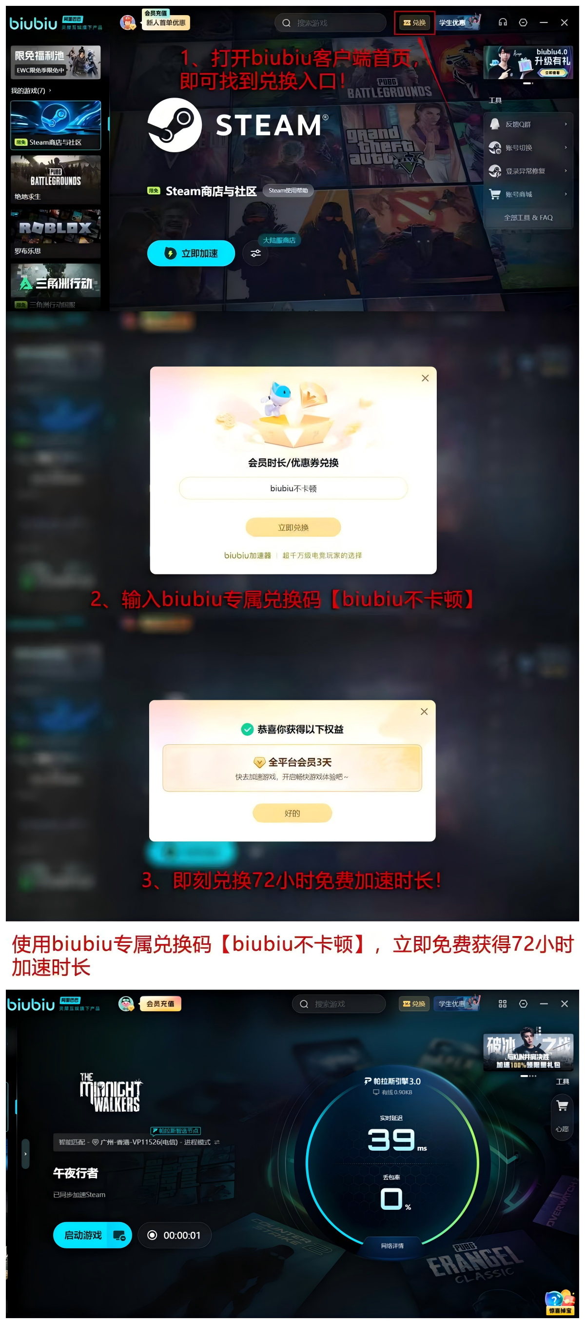 尚未尝试的玩家可能对其效果存疑,现输入口令【biubiu不卡顿】,按指引操作即可免费领取72小时高级权限;新注册用户额外赠送24小时,合计达96小时体验时长。该策略支持“先体验后决策”,已成多数硬核玩家的首选接入方式。