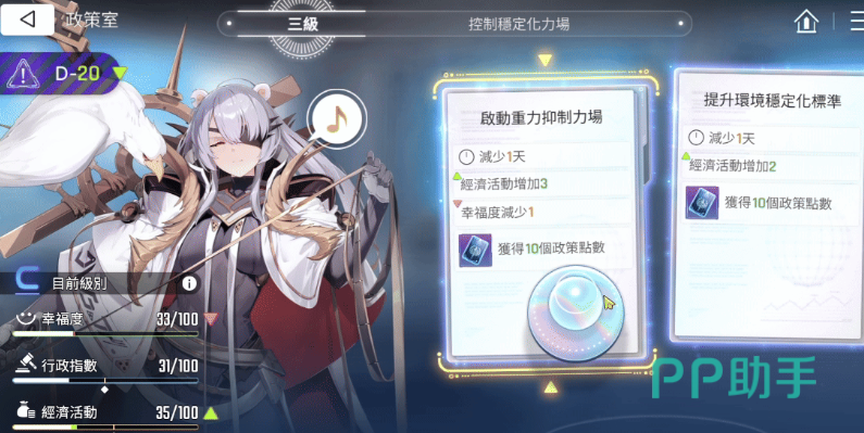 政策批准系统是增强家园综合能力的核心途径。每次执行政策审批后,家园的四项基础属性——行政指数、经济活动、治安指数与幸福度——都将获得提升。这四项数值直接影响后续任务推进效率与角色养成速度,家园发展越完善,整体游戏进程也将更加顺畅。