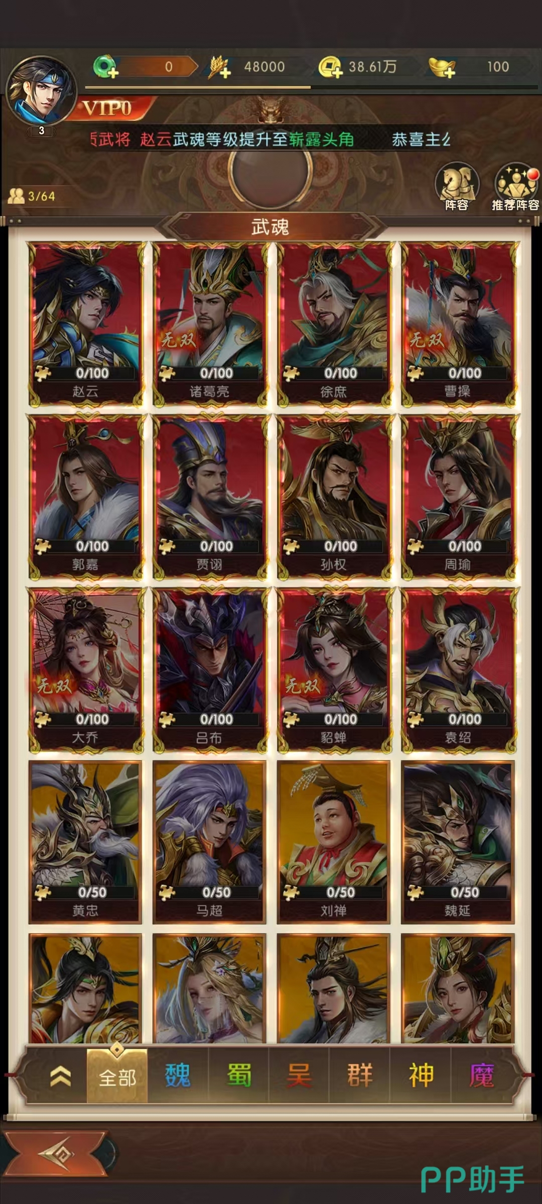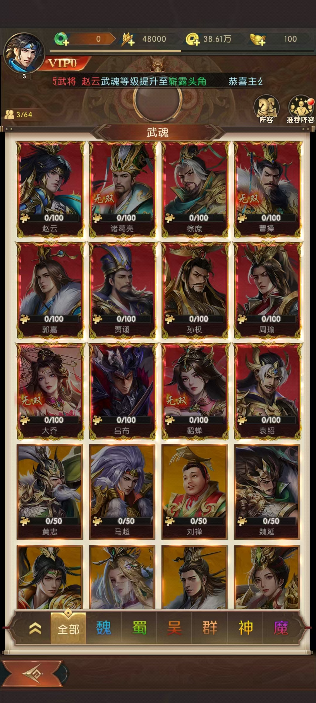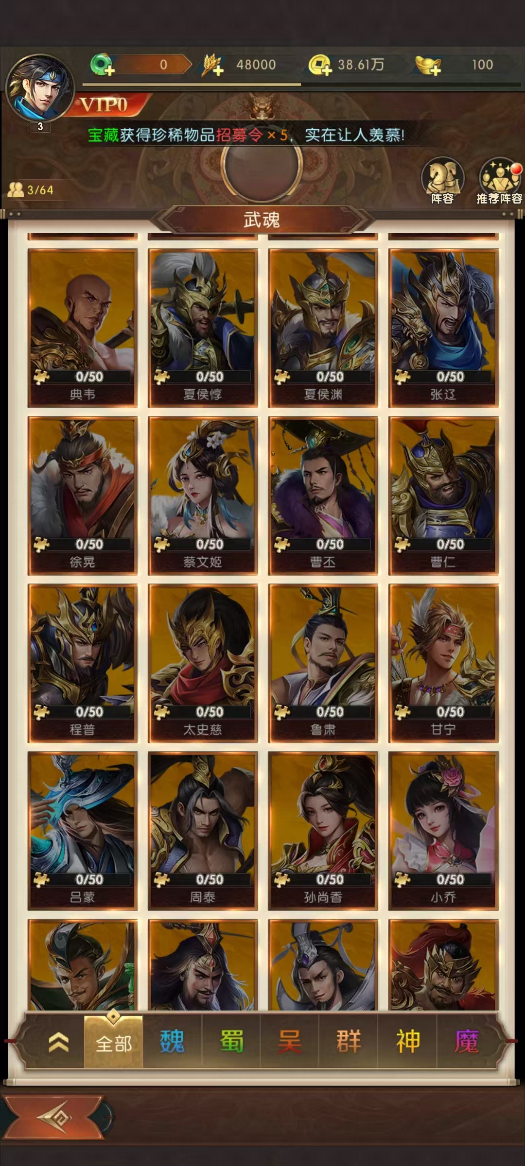 抽卡前,一定要明确自己的阵容需求。如果想组建蜀国爆发流阵容,就重点抽取蜀国高输出武将,避免盲目乱抽。活动卡池开启时,优先攒够保底次数再抽,能大大提高抽到限定武将的概率。比如,提前计算好所需元宝和招募令数量,在活动开启时直接抽取保底次数抽到心仪武将后,培养至关重要。通过升级、升星提升武将属性和技能等级,搭配合适的装备,能让武将实力大增。阵容搭配上,要考虑武将之间的技能联动和阵营加成。如魏国武将多有中毒和召唤物技能,搭配在一起能产生强大的连锁反应。