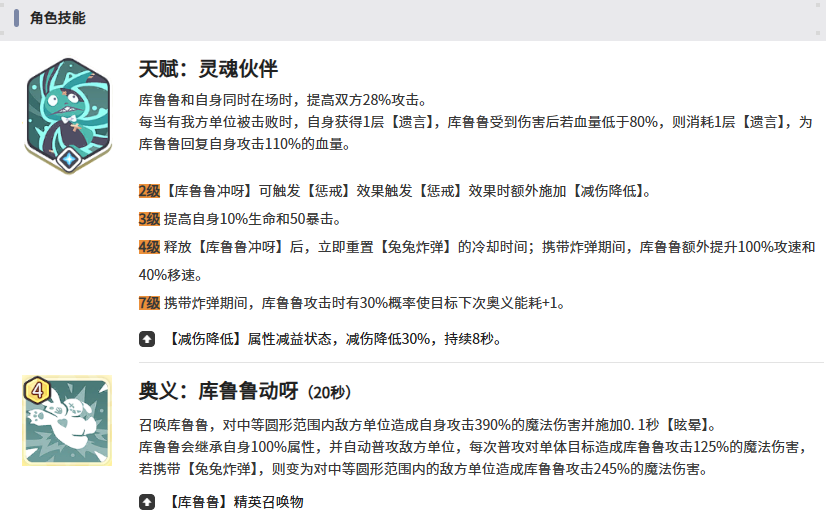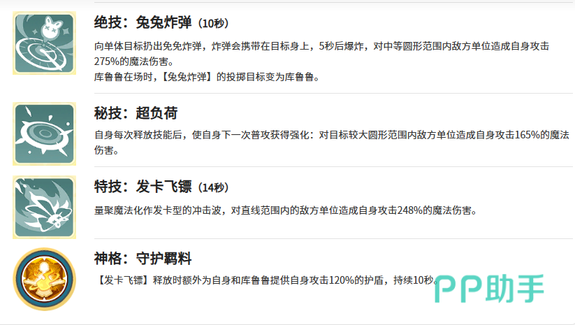 主动技能方面,“兔兔炸弹”为定时定点AOE技能,爆炸延迟固定,伤害占比达全角色输出的42%以上,是主要的节奏型输出手段;“秘技”可强化下一次普攻,弥补基础平A倍率偏低的短板,属关键补伤节点;“特技”释放冲击波,拥有全角色最高单段瞬发伤害系数,配合天赋加成后,对精英单位与Boss目标具备极强穿透力,符合高配法师主C的定位标准。
