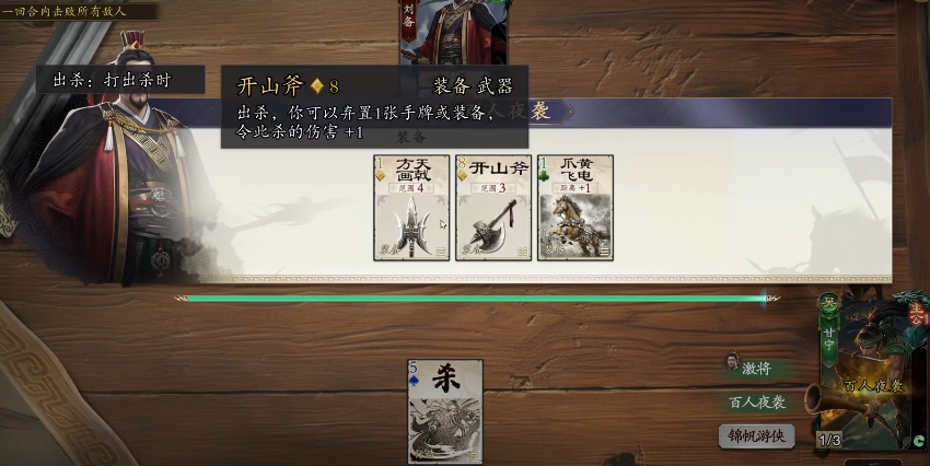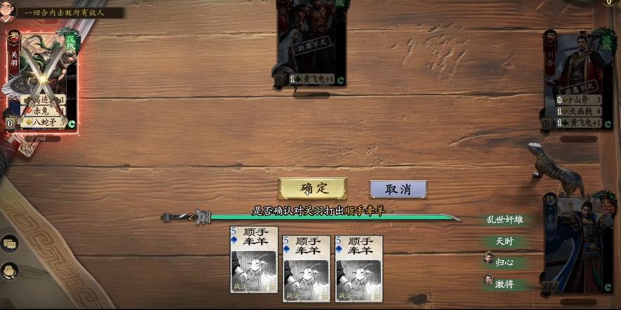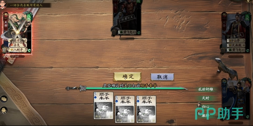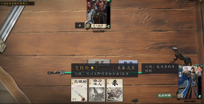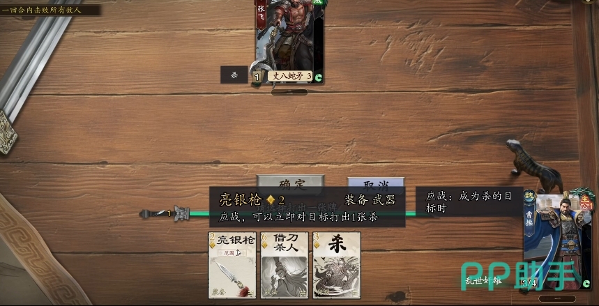 02:这一关考验的是玩家的武器使用技巧,先装备上威力无穷的亮银枪,然后对张飞施展借刀杀人这张卡。当张飞打出杀时,武器特效随即触发,大家趁势补上一张杀,便可一举击败张飞,赢得胜利。