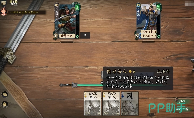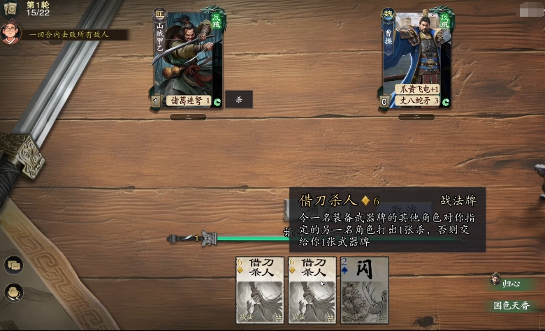 06:这一关需巧妙运用借刀杀人这张卡,先对曹操使用借刀杀人,不仅能获得强力武器丈八蛇矛,还能装备它并摸两张杀,增强自身攻击力,接着再次对山贼使用借刀杀人,但这次攻击目标选择大乔,利用她的技能国色天香,不仅可以摸一张牌,还能将杀转移至曹操,一举两得,最后对山贼打出剩余的杀,即可顺利获胜。